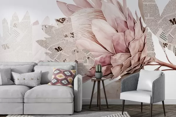 Papel tapiz Flores de protea, arte periodístico, floral, tropical, colores beige pastel Nr. w03667v4