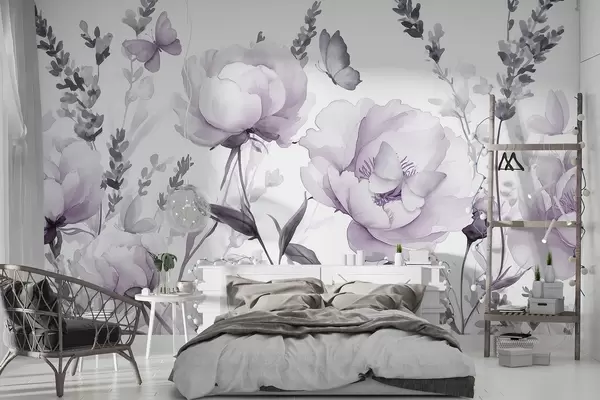 Papel tapiz Pradera de flores, peonías, lavanda, mariposas, estilo acuarela, colores de pupas Nr. w03668v3