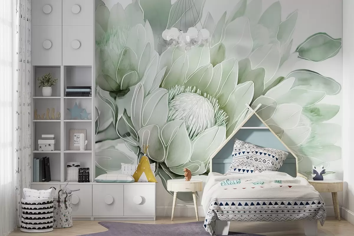 Papel tapiz Hermosas flores de protea, dibujo lineal, tropical, colores verdes Nr. w03669v2