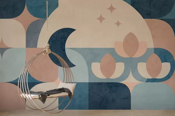 Papel tapiz abstracción geométrica, donde las formas suaves se entrelazan suavemente con símbolos de la luna, las flores y las estrellas Nr. w03723