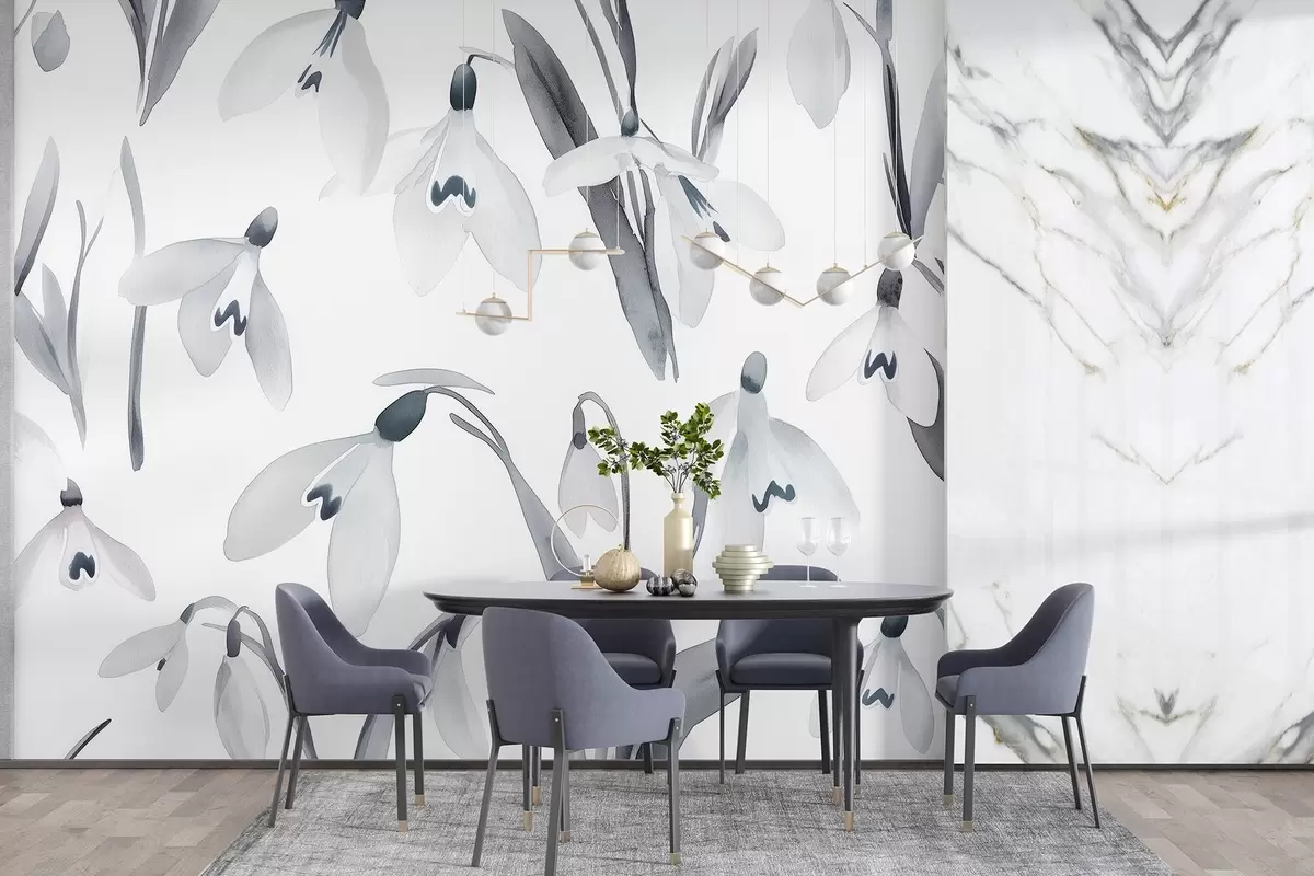 Papel tapiz Snowdrops flores en estilo acuarela, colores grises Nr. w03754v1