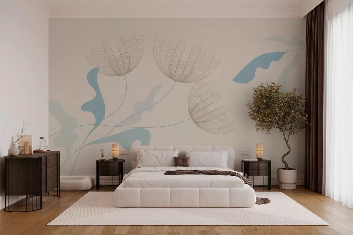 Papel tapiz elegantes flores minimalistas en tonos azul claro sobre fondo beige Nr. w03763v1