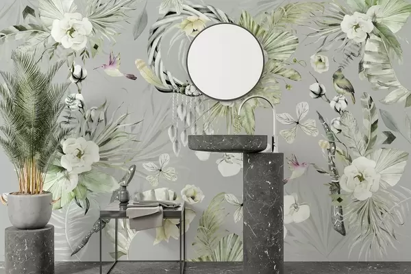 Papel tapiz Adorno de estilo boho con flores de peonía y pájaros, estilo acuarela, colores verdes Nr. w03885v2