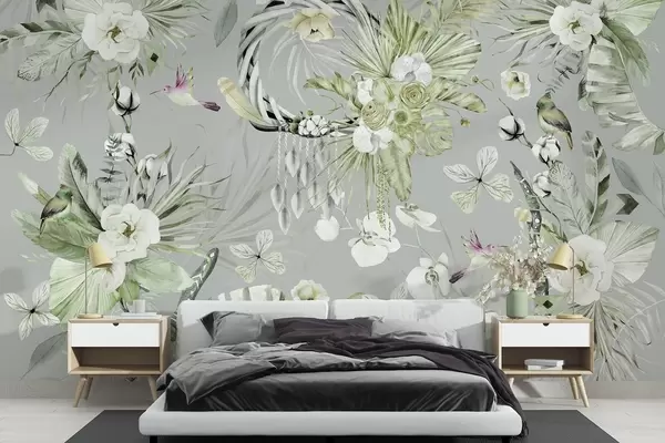 Papel tapiz Adorno de estilo boho con flores de peonía y pájaros, estilo acuarela, colores verdes Nr. w03885v2