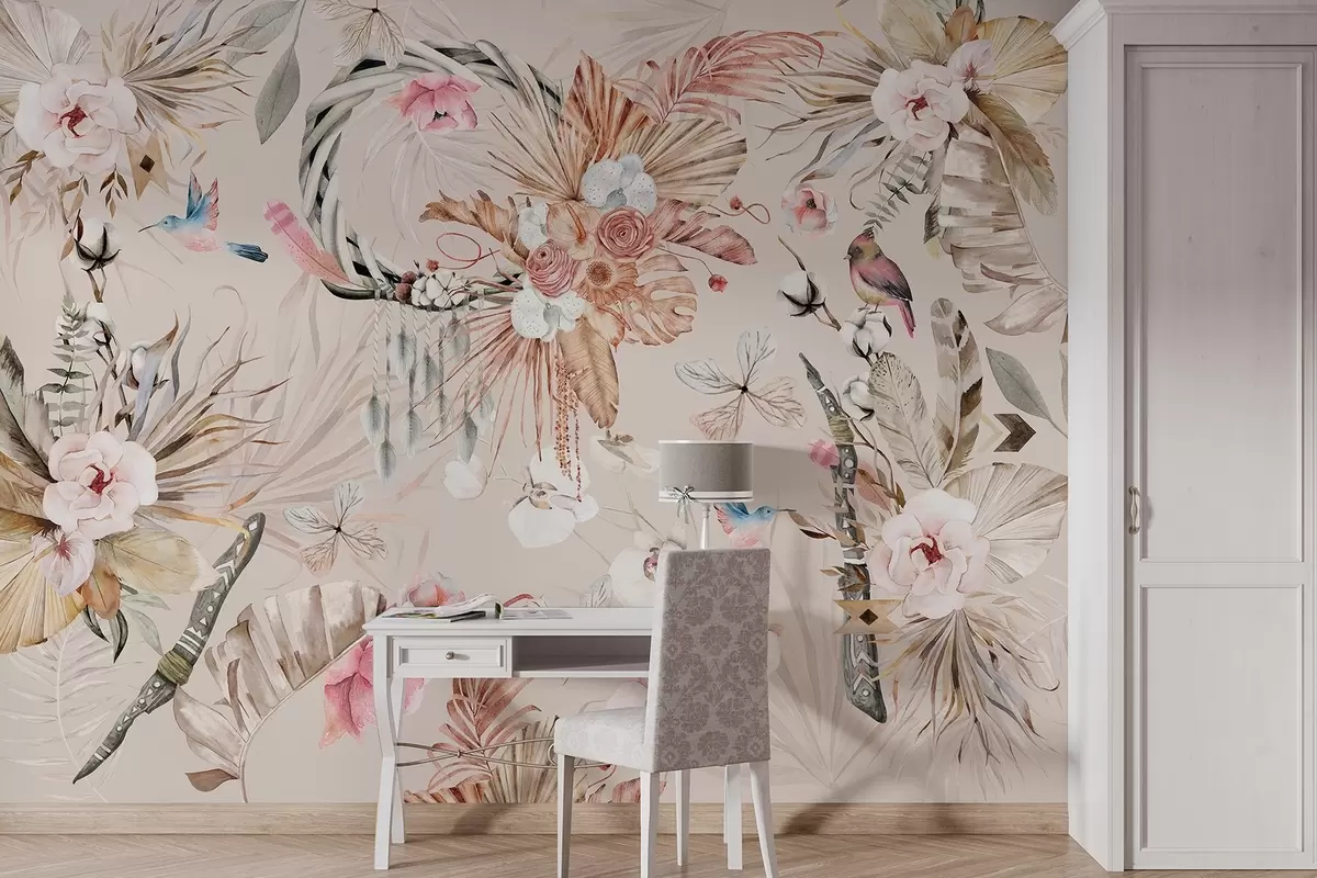 Papel tapiz Adorno de estilo boho con flores de peonía y pájaros, estilo acuarela, colores suaves Nr. w03885v3
