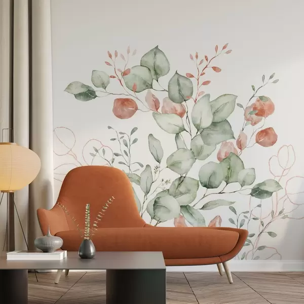 Papel tapiz Vegetación y ramas imitación de acuarela texturizada, tonos verdes y rojos Nr. w03927v1