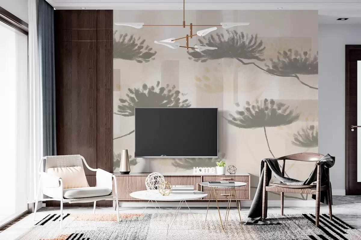 murales de pared geometría texturizada en tonos beige y crema con estilizadas flores de paraguas w03960