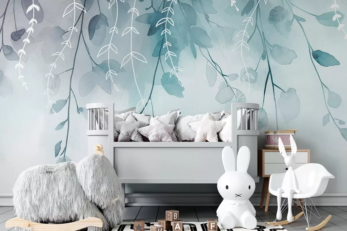 Papel tapiz Ramas con hojas en estilo acuarela, colores aguamarina naturales Nr. w04007v3