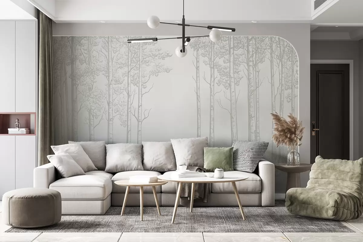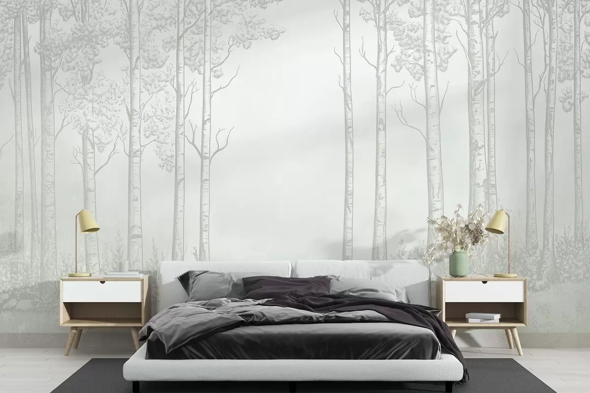 Papel tapiz Bosque con abedules, minimalismo, naturaleza, paleta de colores verdes Nr. w04009v1