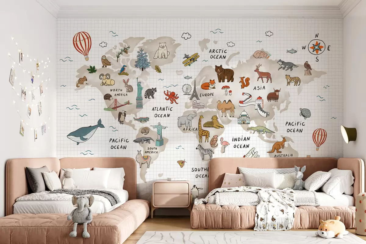 Papel tapiz Mapamundi con animales y puntos de referencia Nr. w04011