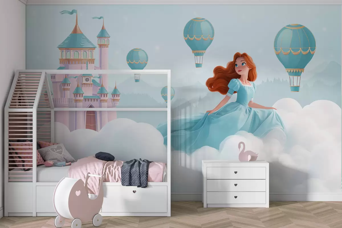 Papel tapiz Princesa entre las nubes sobre el fondo del paisaje con el castillo Nr. w04015