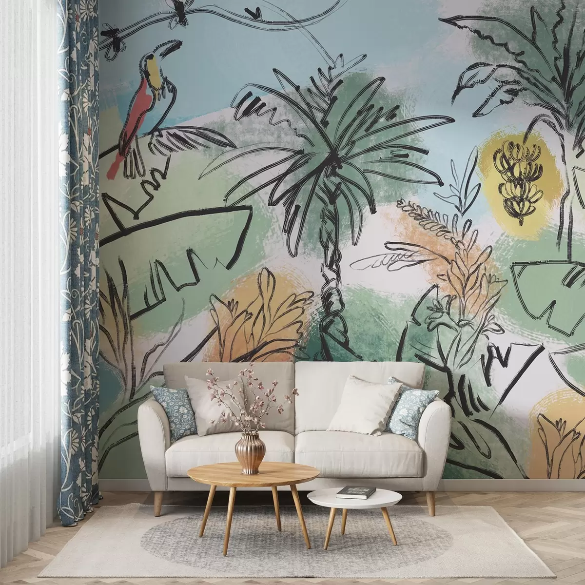 Papel tapiz Estampado tropical con loros, colores vivos, trópicos Nr. w04019