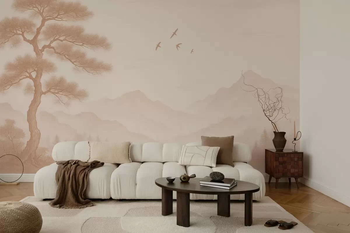 Papel tapiz panorama de colinas con un gran árbol en tonos moca Nr. w04033v1