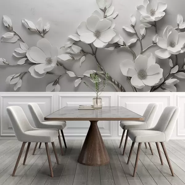 murales de pared Rama floral dimensional en blanco puro y tonos neutros w04039v2