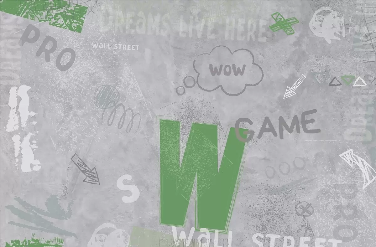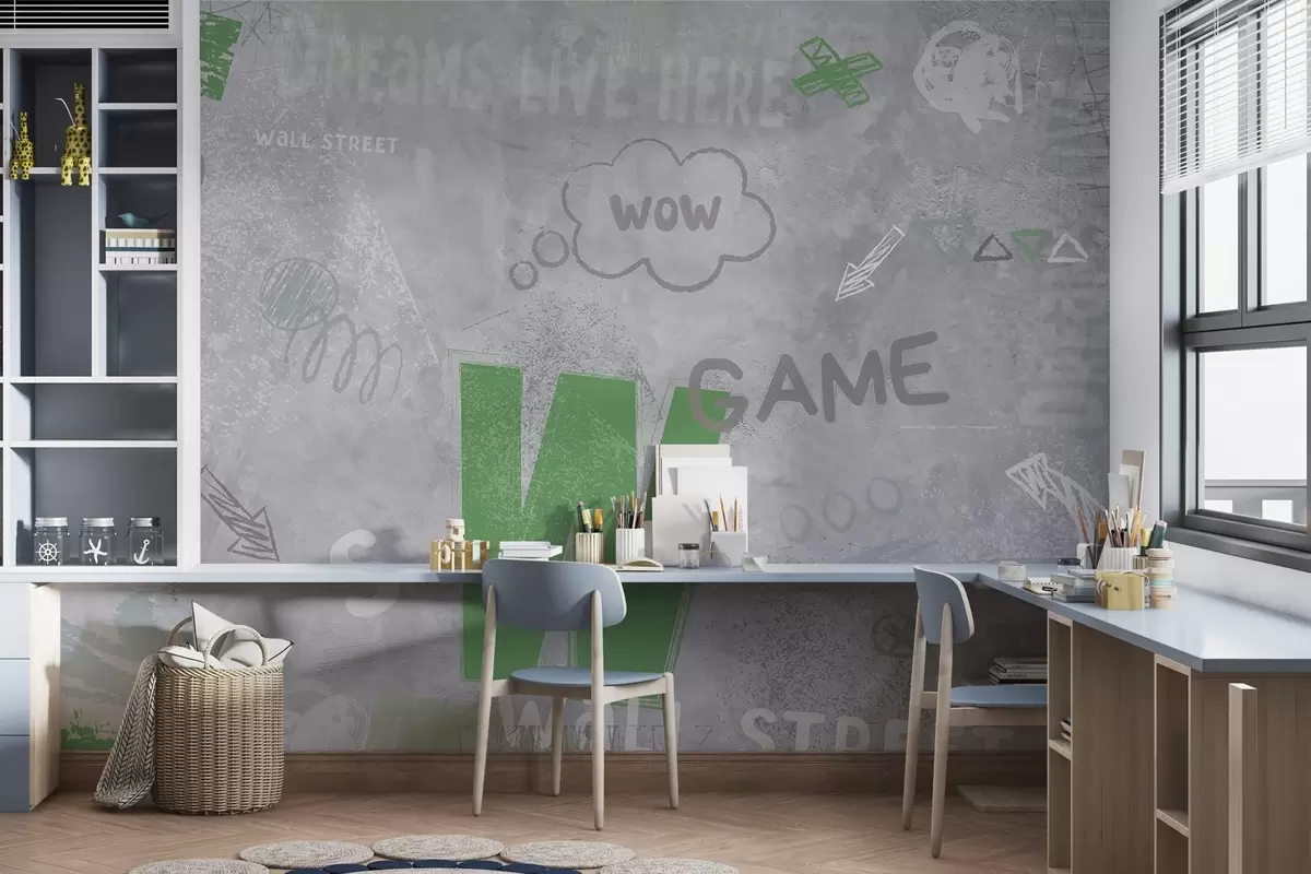 Papel tapiz Diseño de arte callejero con letras de color verde en el fondo de la pared de hormigón Nr. w04056v2