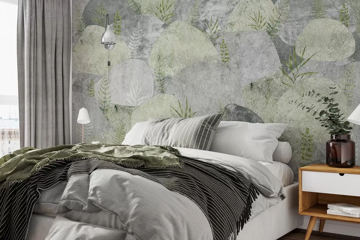 Papel tapiz Piedras con plantas, helecho, nórdico, estilo rústico, colores gris y verde Nr. w04064v2