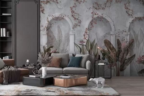 Papel tapiz Muro de hormigón con arcos y plantas tropicales, florales, colores burdeos Nr. w04065v1