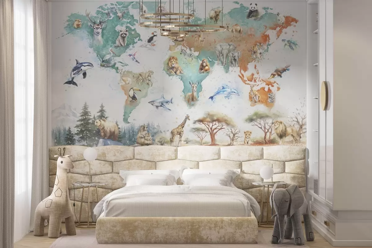Papel tapiz Mapamundi con animales, estilo de ilustración educativa infantil Nr. w04148