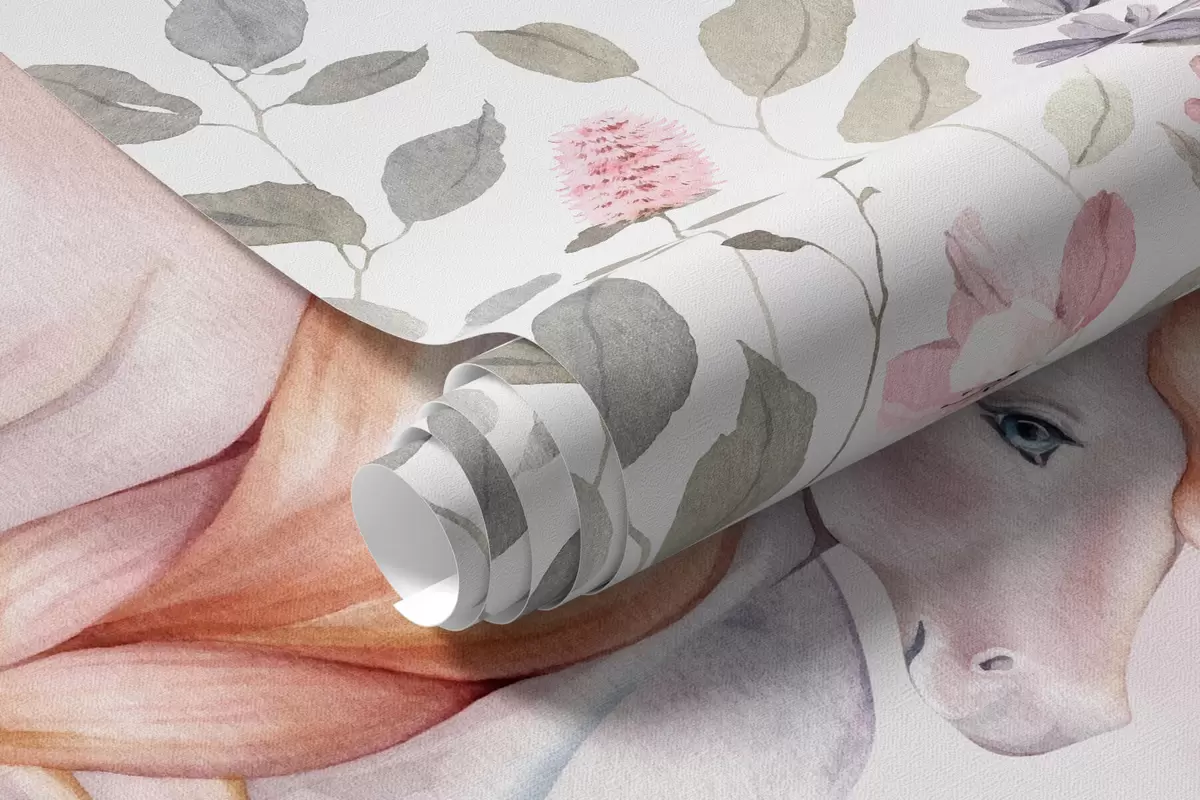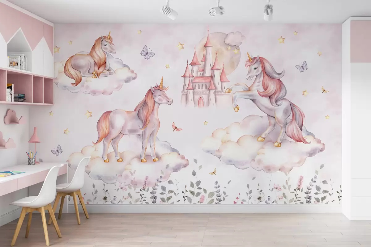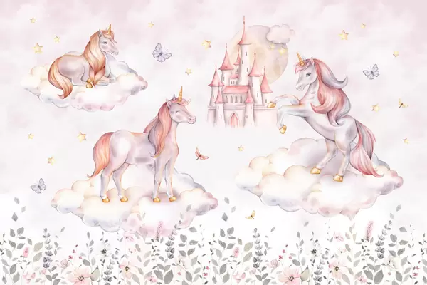 Papel tapiz Unicornios en las nubes con estrellas, mariposas y flores Nr. w04165