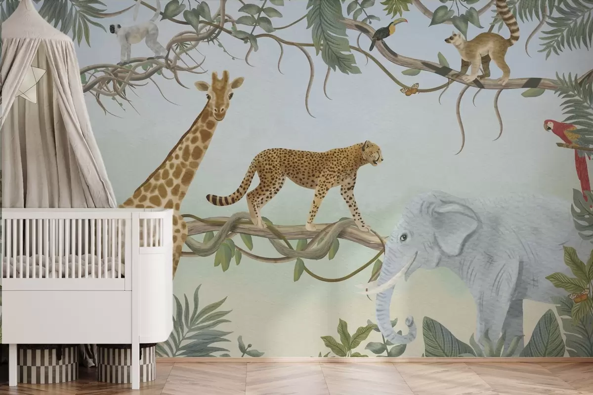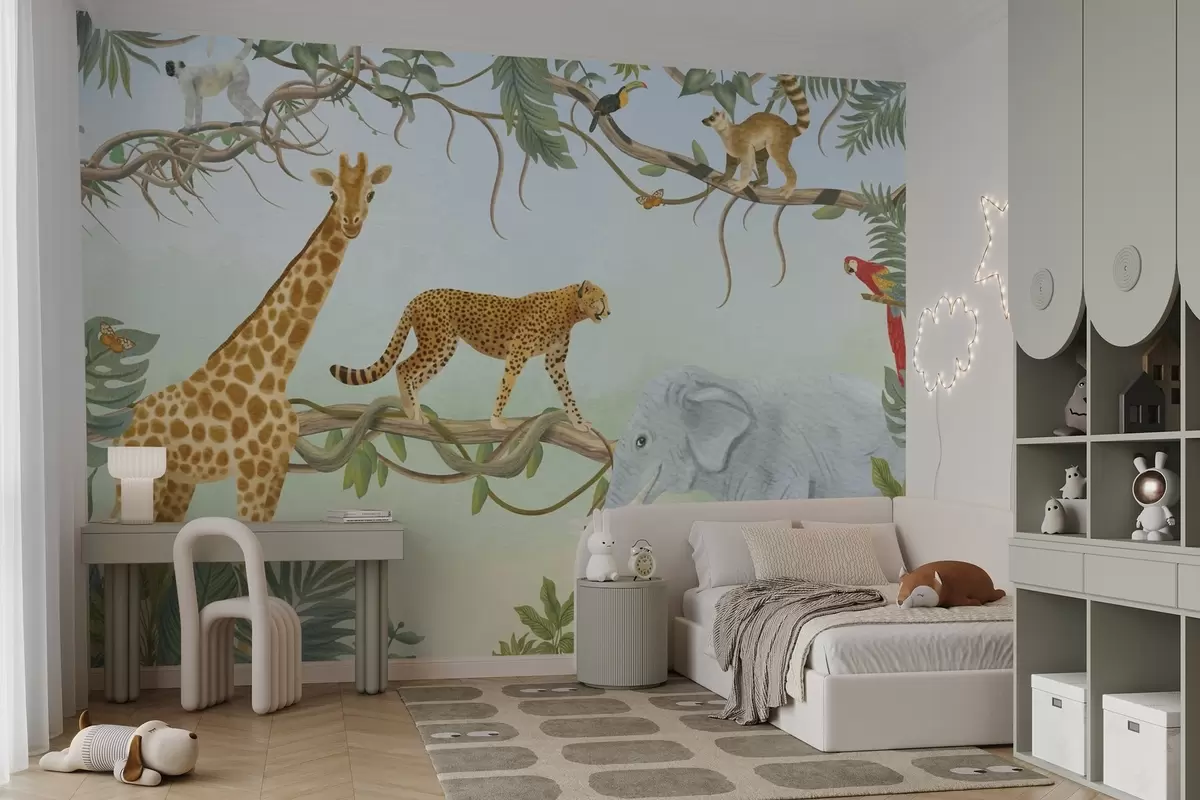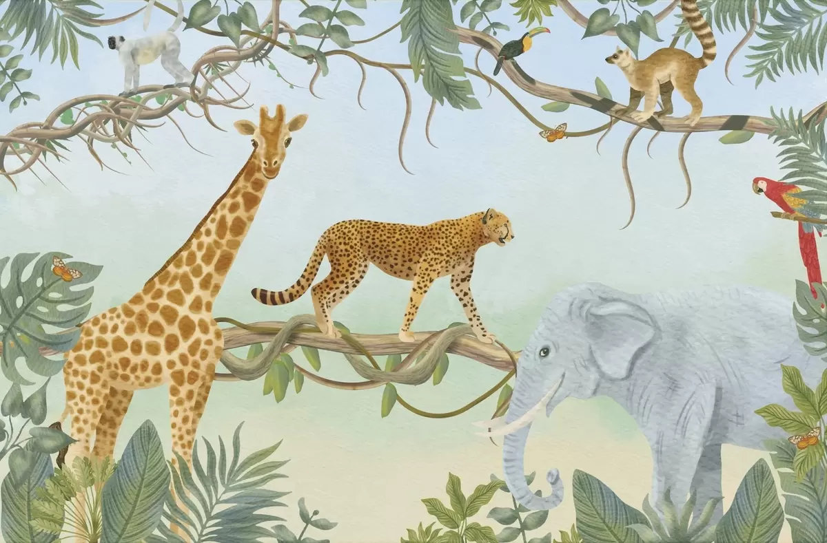 Papel tapiz Ilustración de jungla con jirafa, guepardo y elefante Nr. w04194