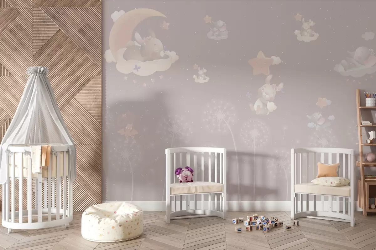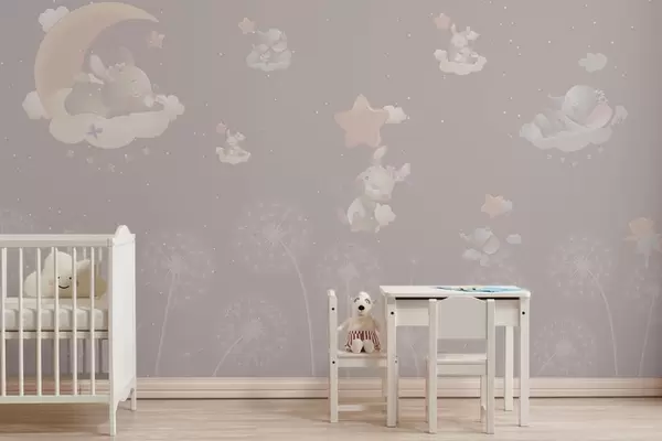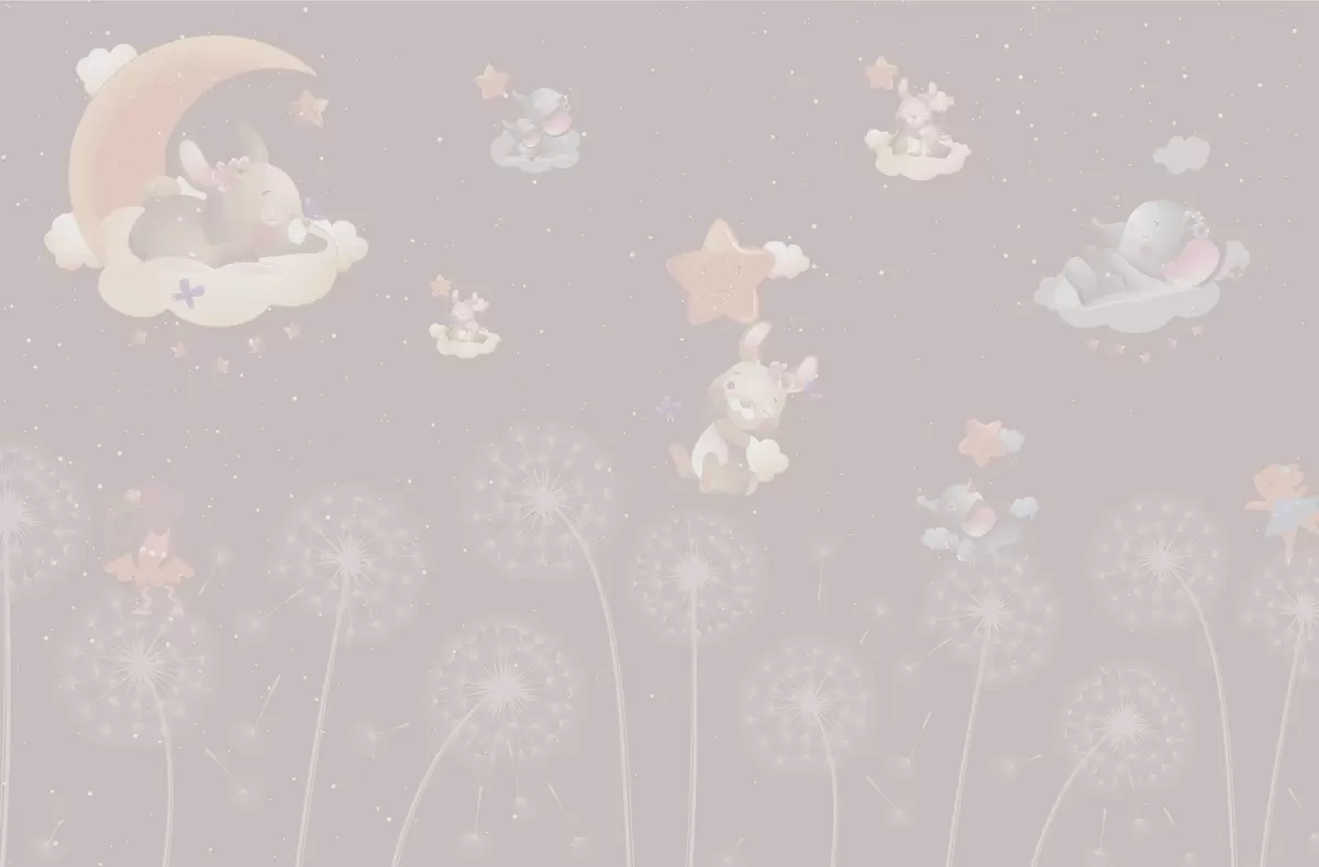 Papel tapiz Noche de cuento de hadas con conejo y dientes de león sobre fondo rosa Nr. w04195v2