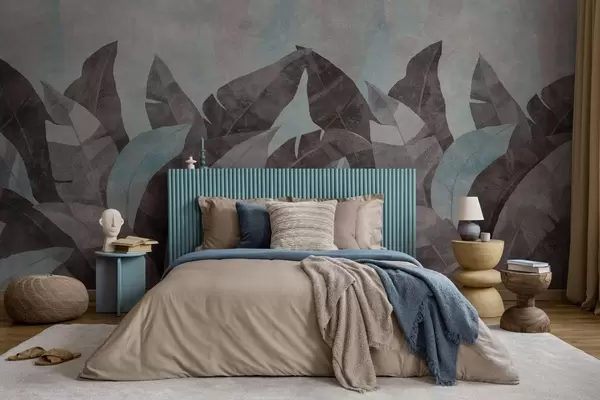 Papel tapiz hojas de plátano texturizadas en tonos azules y grises Nr. w04285v2