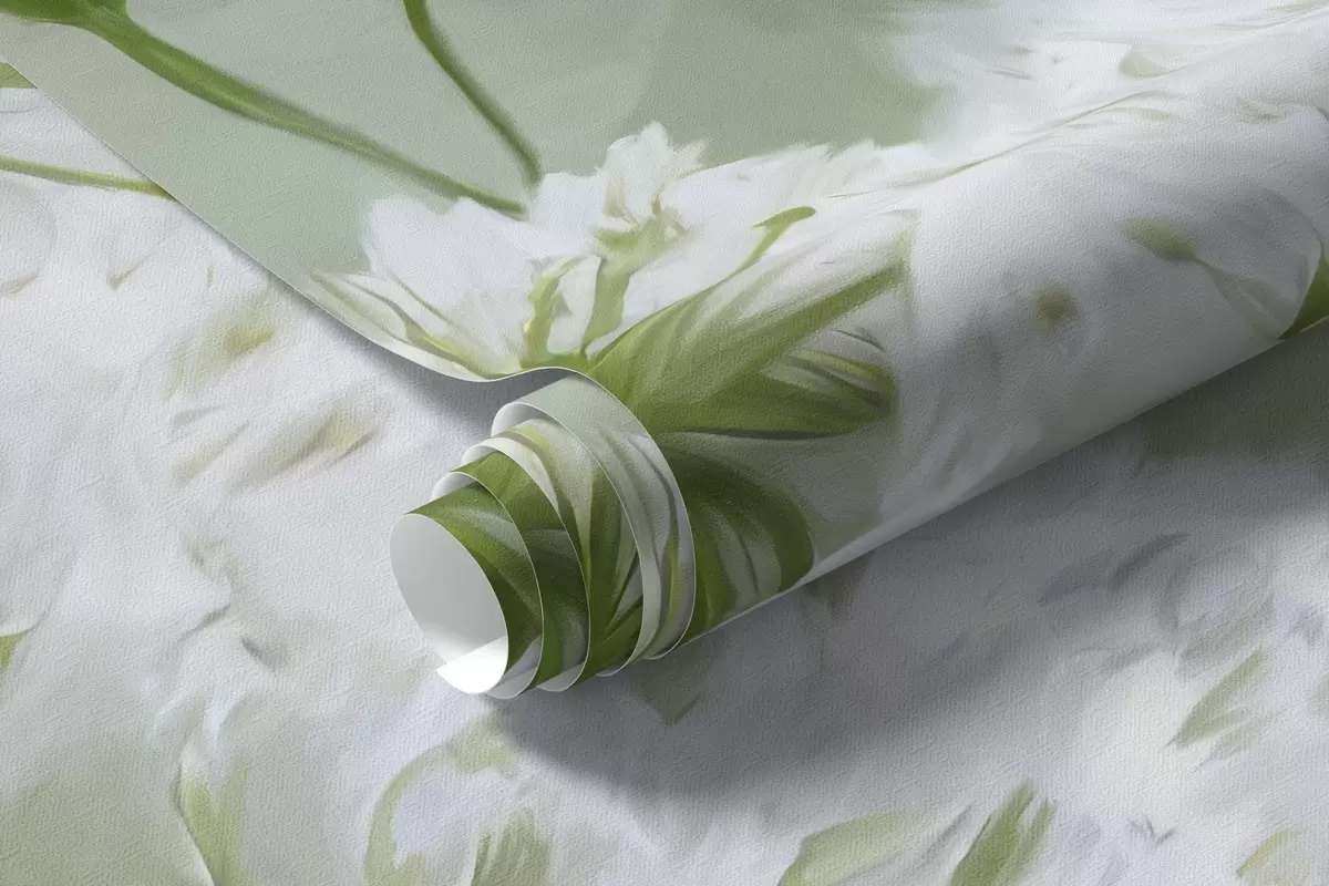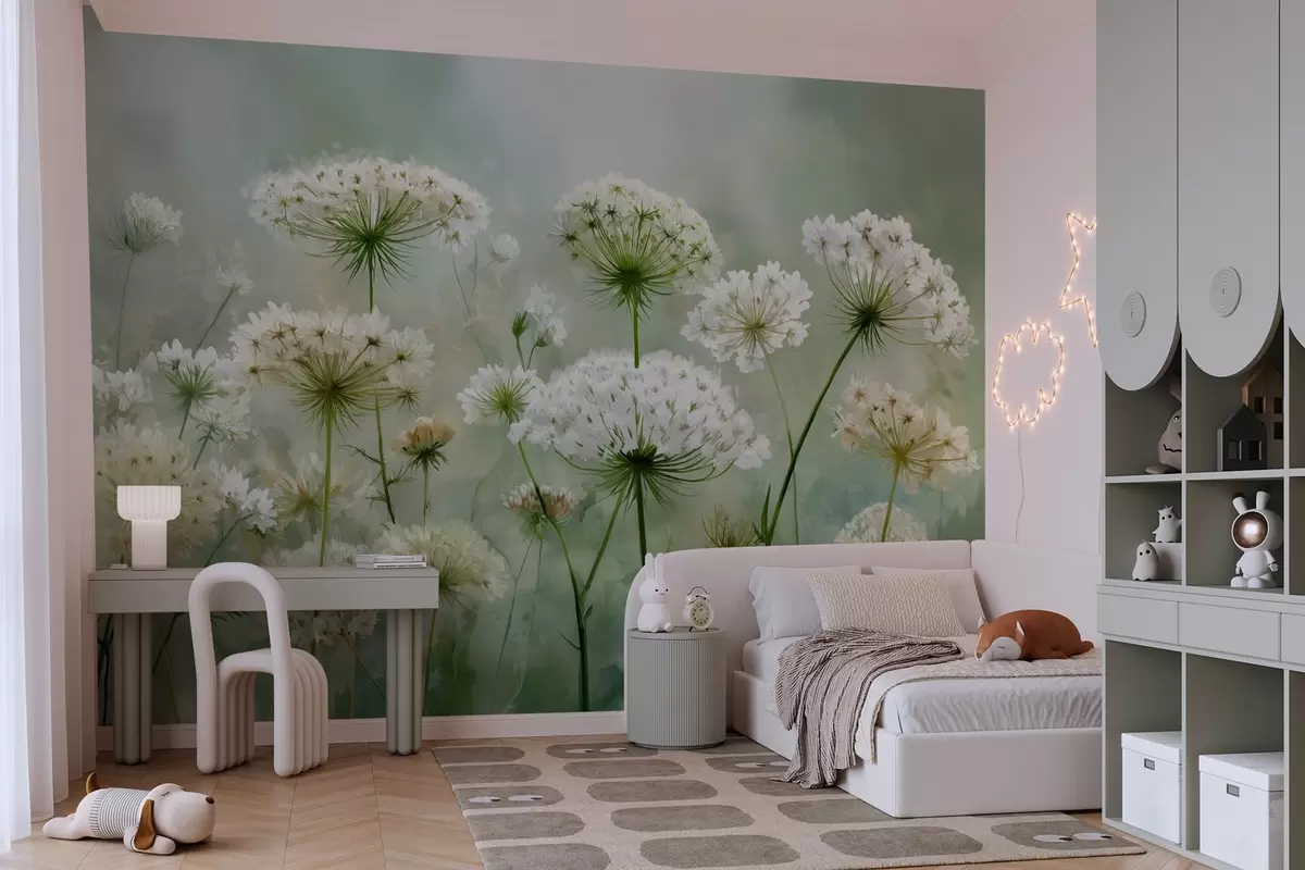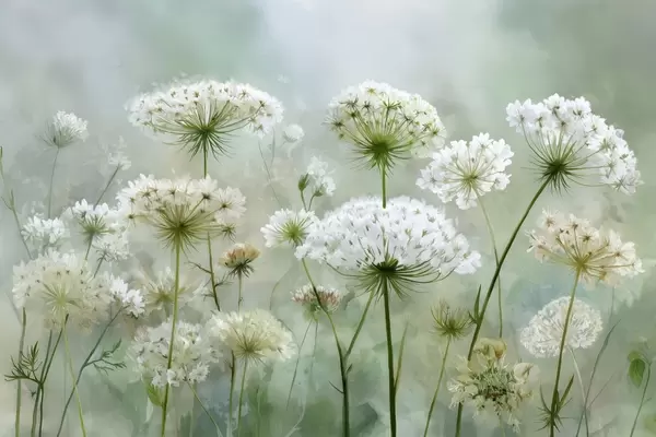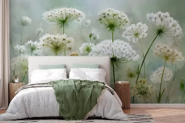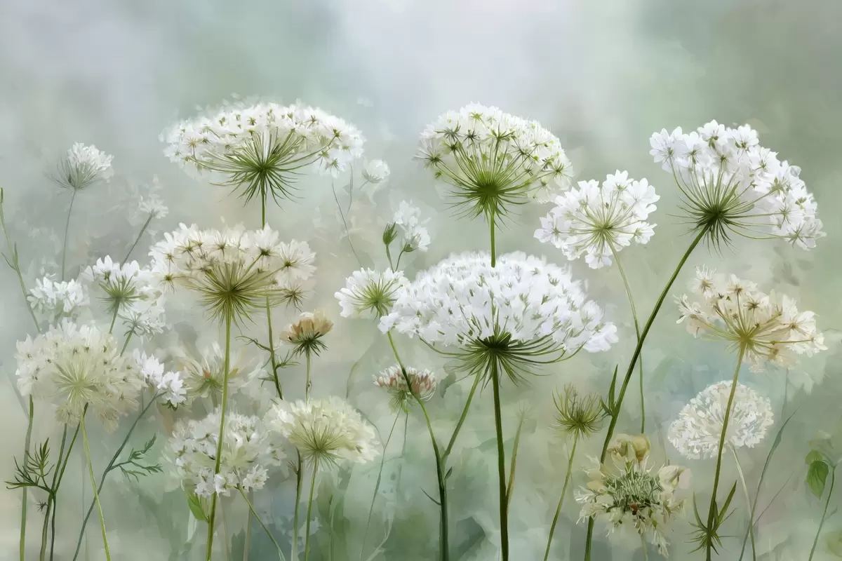 Papel tapiz delicadas flores silvestres blancas Reina Ana, de estilo pintoresco, tonos verdes Nr. w04313