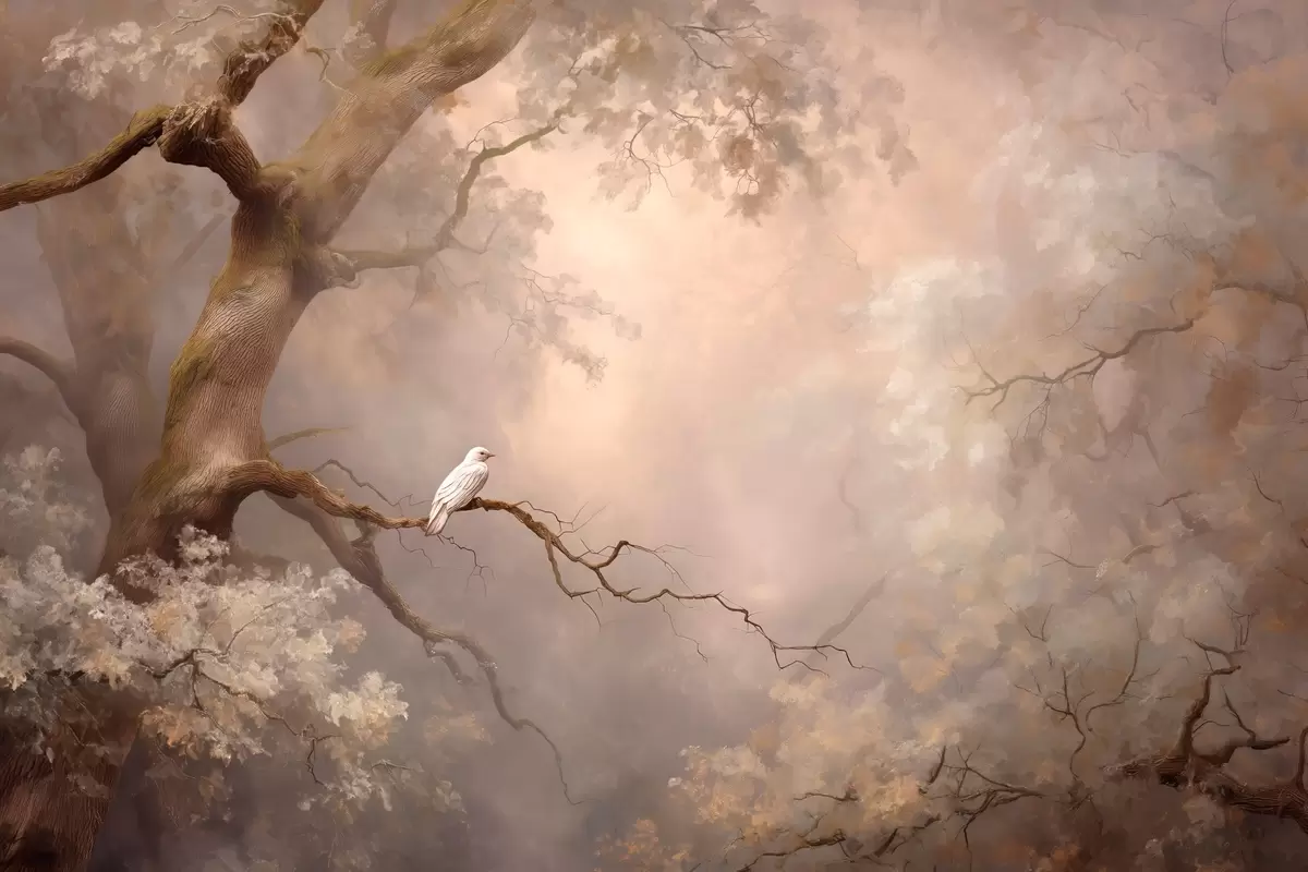 Papel tapiz bosque místico con un pájaro blanco Nr. w04314