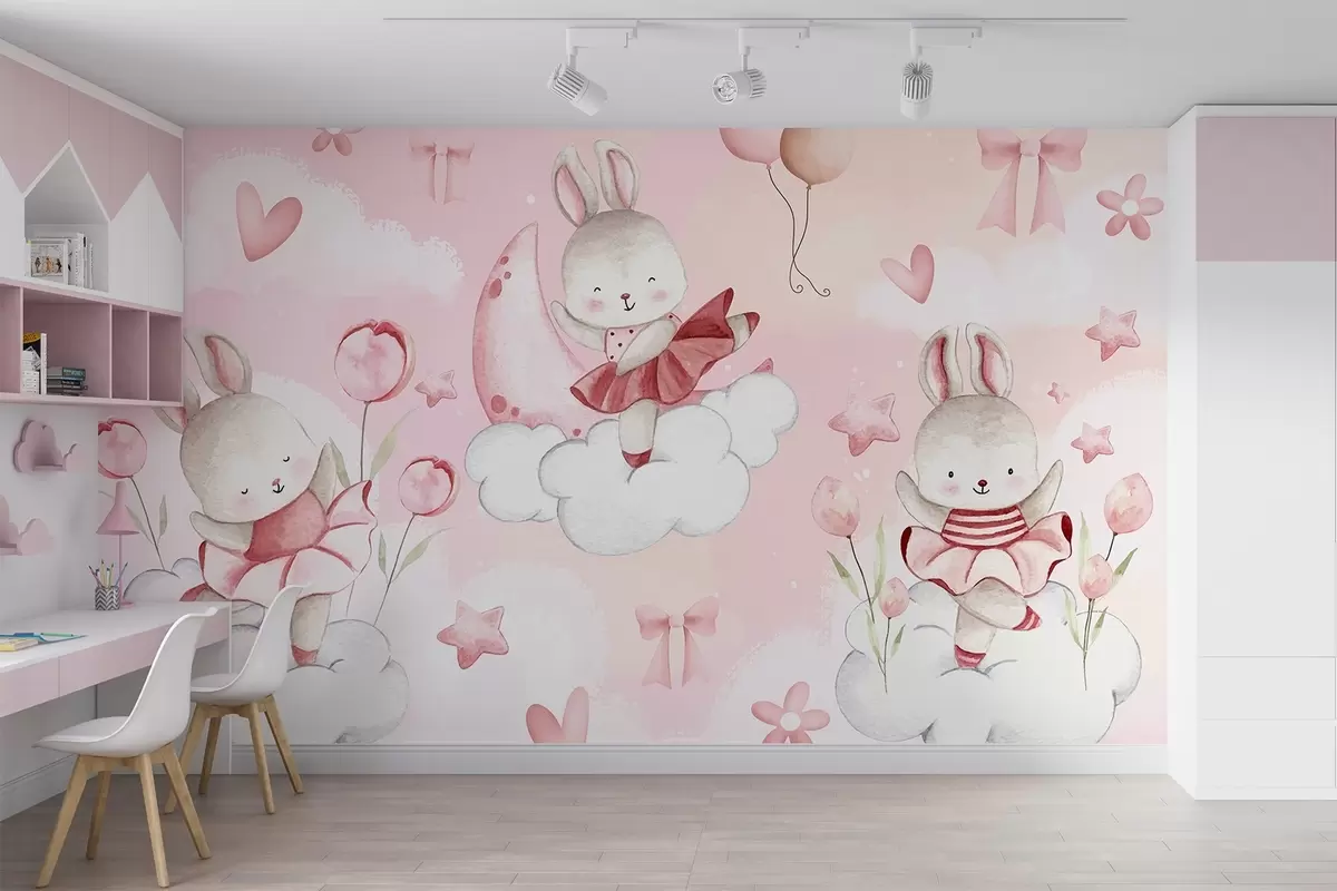 Papel tapiz Conejos con vestidos de ballet rosas sobre nubes Nr. w04333