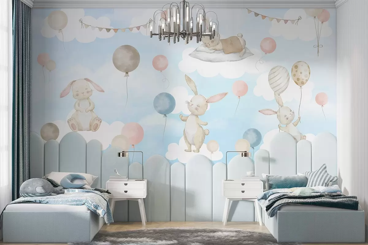 Papel tapiz Conejos con globos sobre nubes Nr. w04337