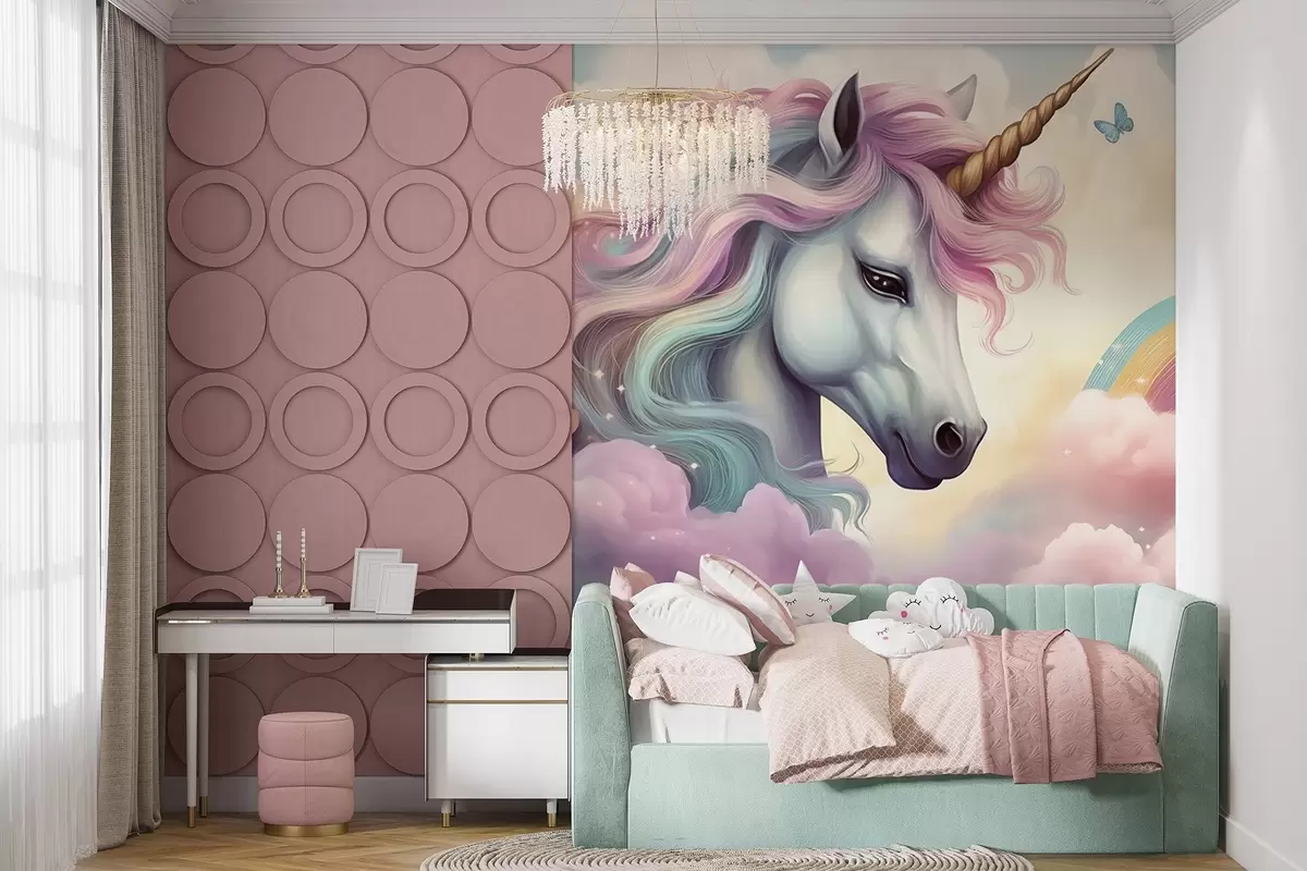 Papel tapiz Unicornio en un cielo nublado con arco iris Nr. w04372