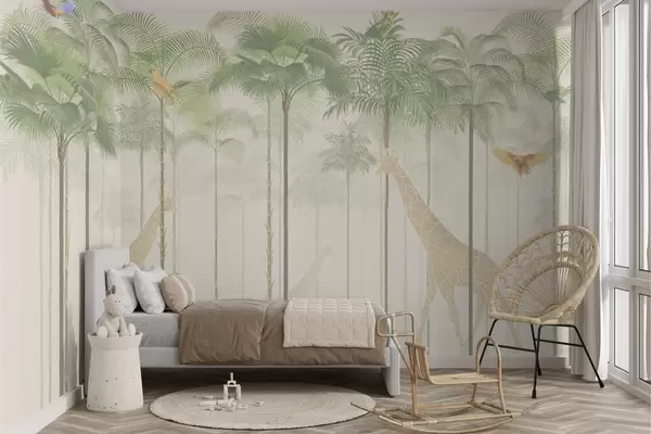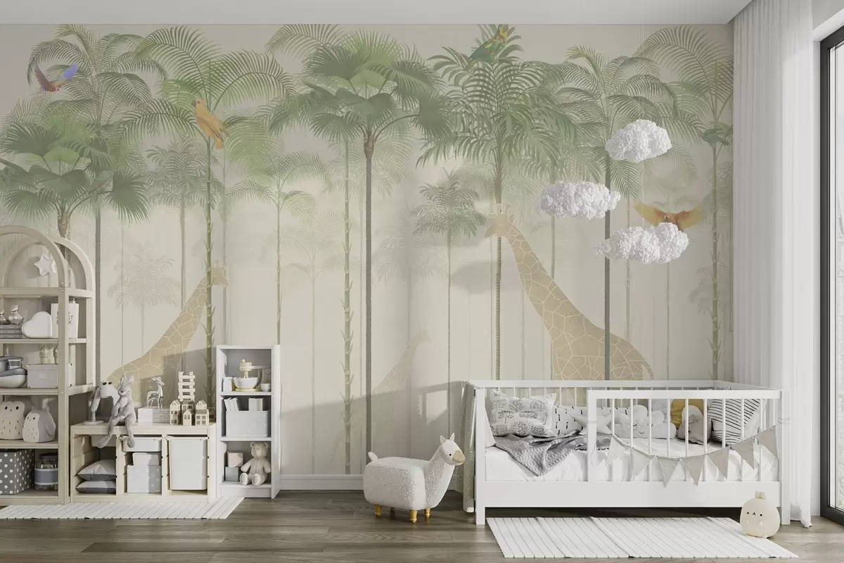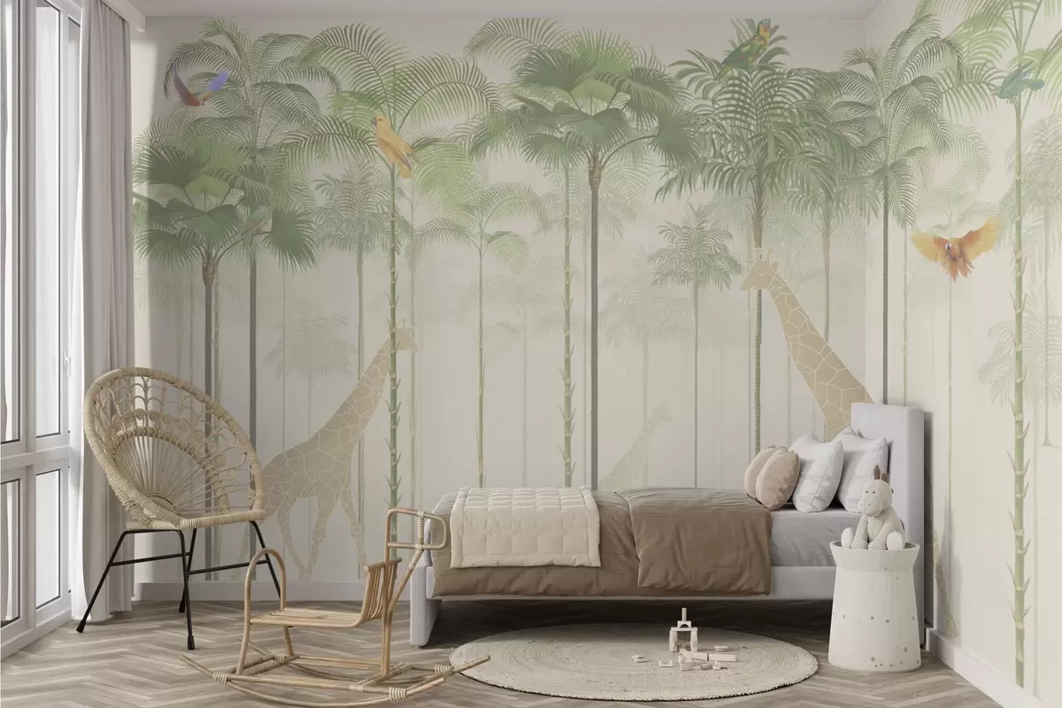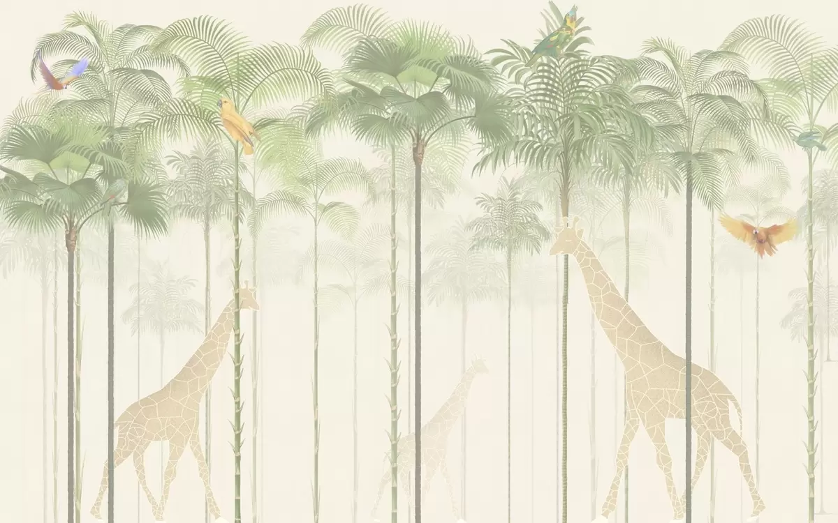Papel tapiz Jirafas y aves tropicales entre altas palmeras Nr. w04400
