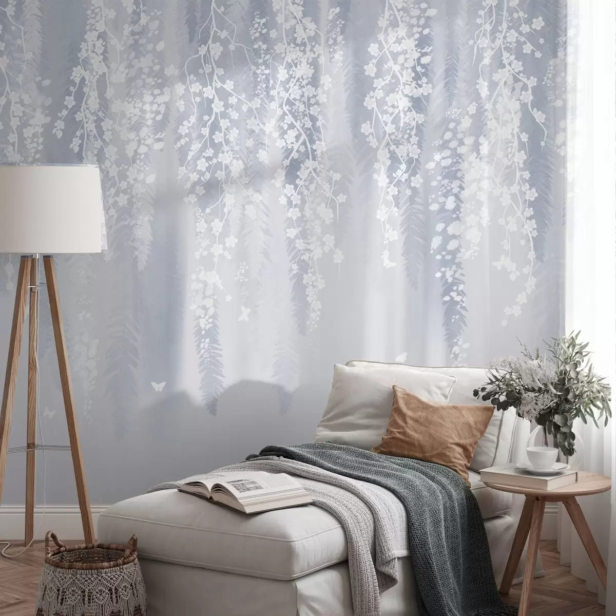 Papel tapiz Fresca versión azul de ramas con flores blancas Nr. w04417v2