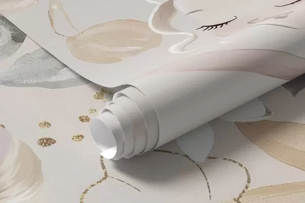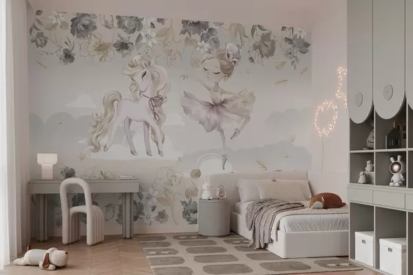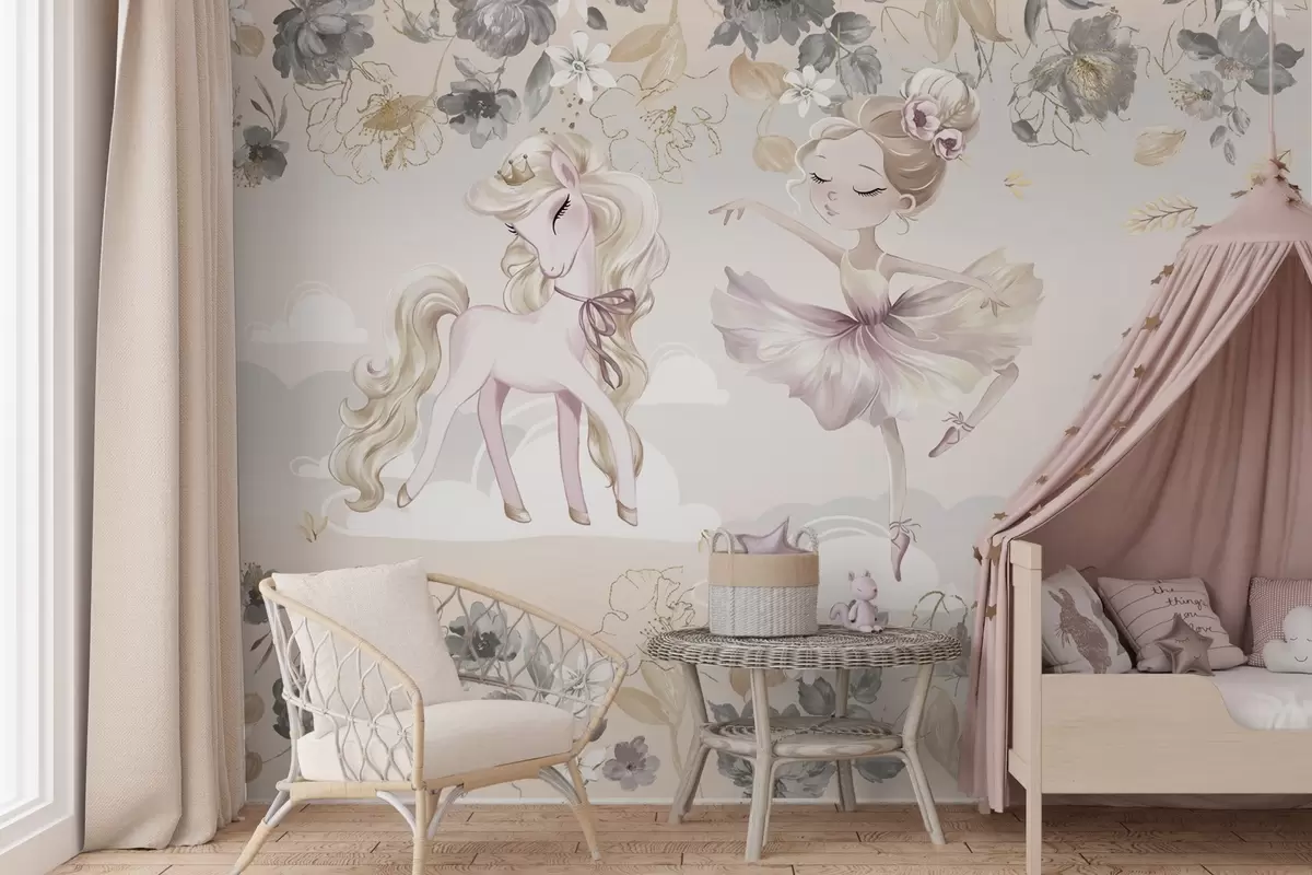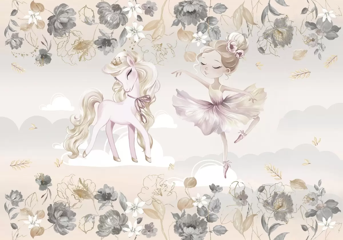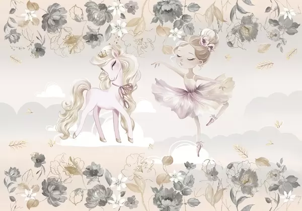 Papel tapiz Poni blanco como la nieve y bailarina entre flores y nubes Nr. w04419