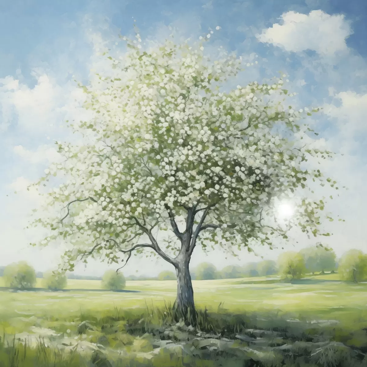 Papel tapiz Un árbol solitario en un campo con flores blancas Nr. w04445