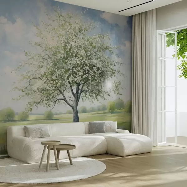 Papel tapiz Un árbol solitario en un campo con flores blancas Nr. w04445