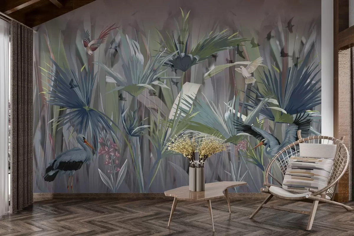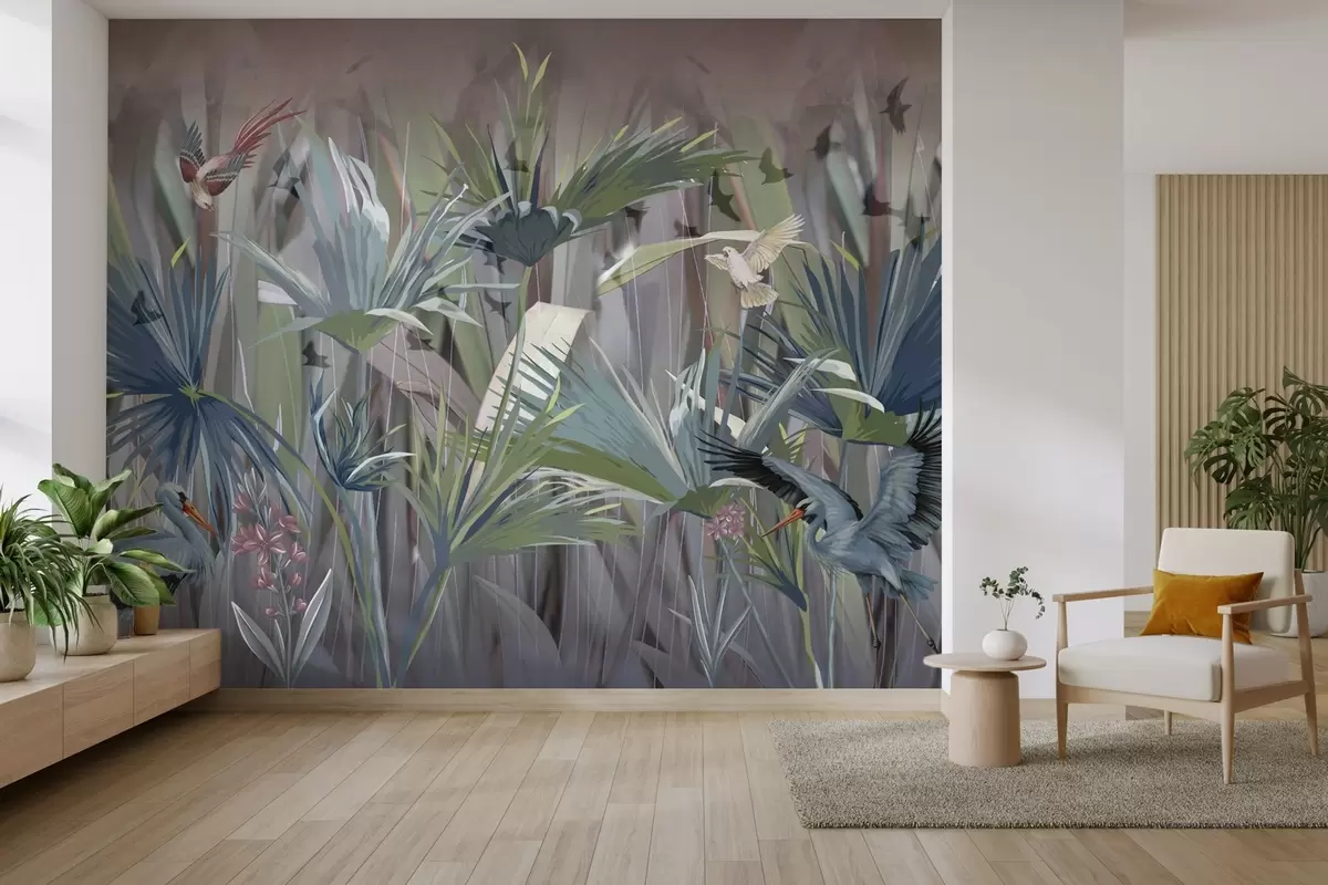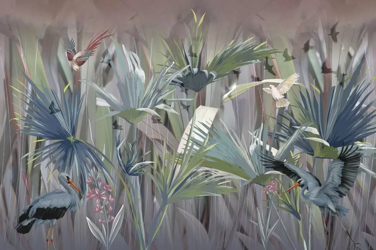 Papel tapiz Pájaros exóticos entre palmeras y flores Nr. w04458