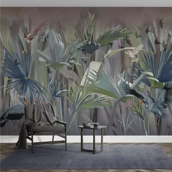 murales de pared Pájaros exóticos entre palmeras y flores w04458