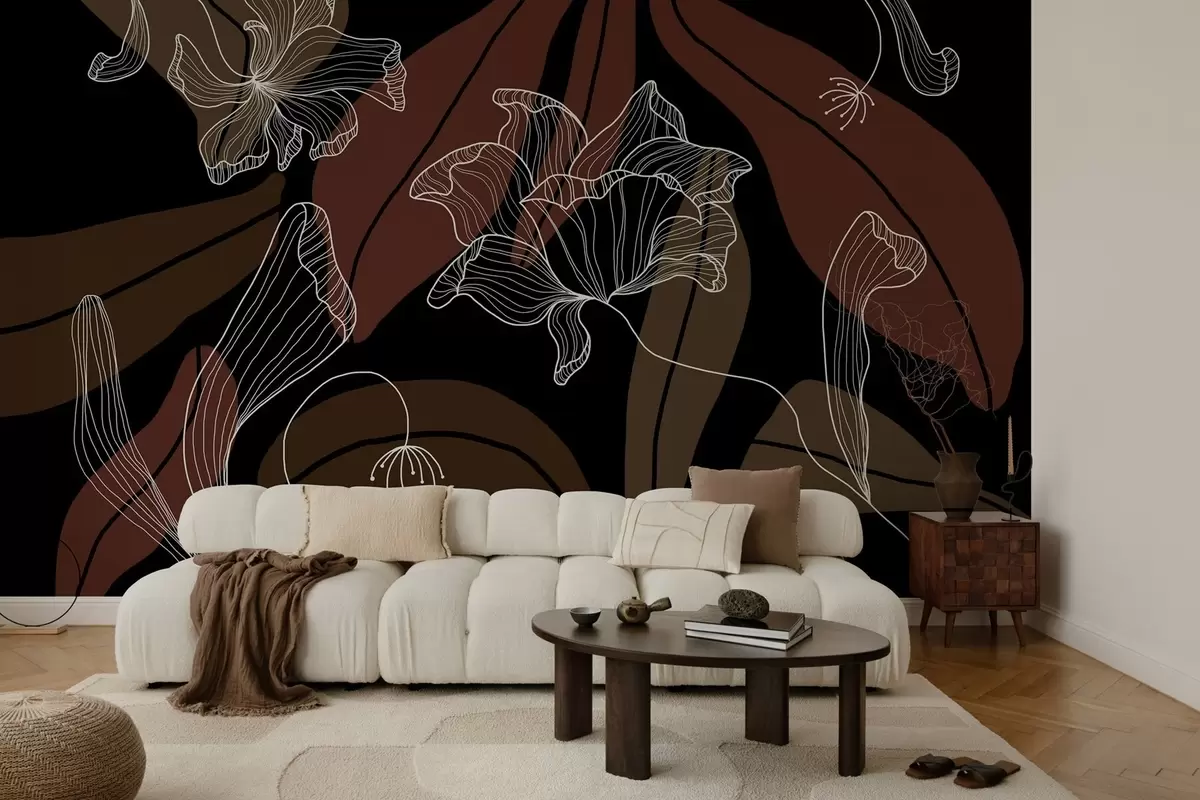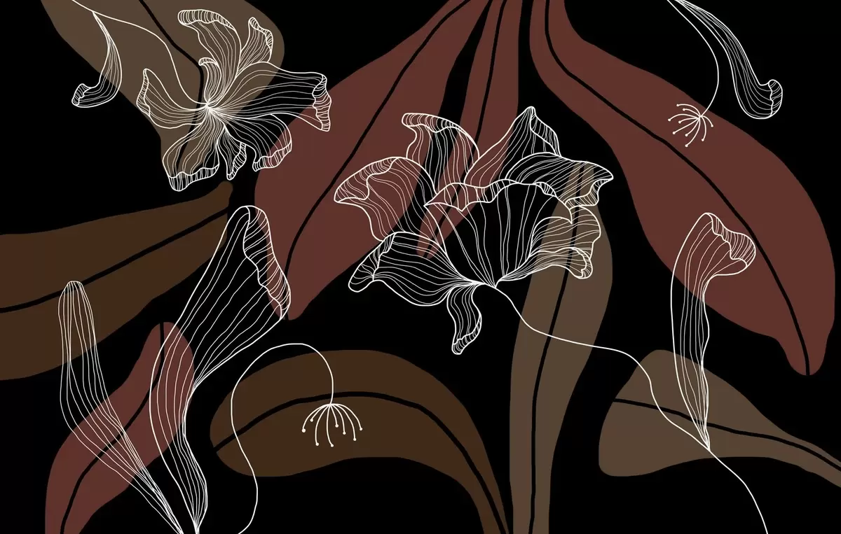 Papel tapiz hojas y flores abstractas en tonos empolvados y beige sobre un fondo oscuro Nr. w04499v3