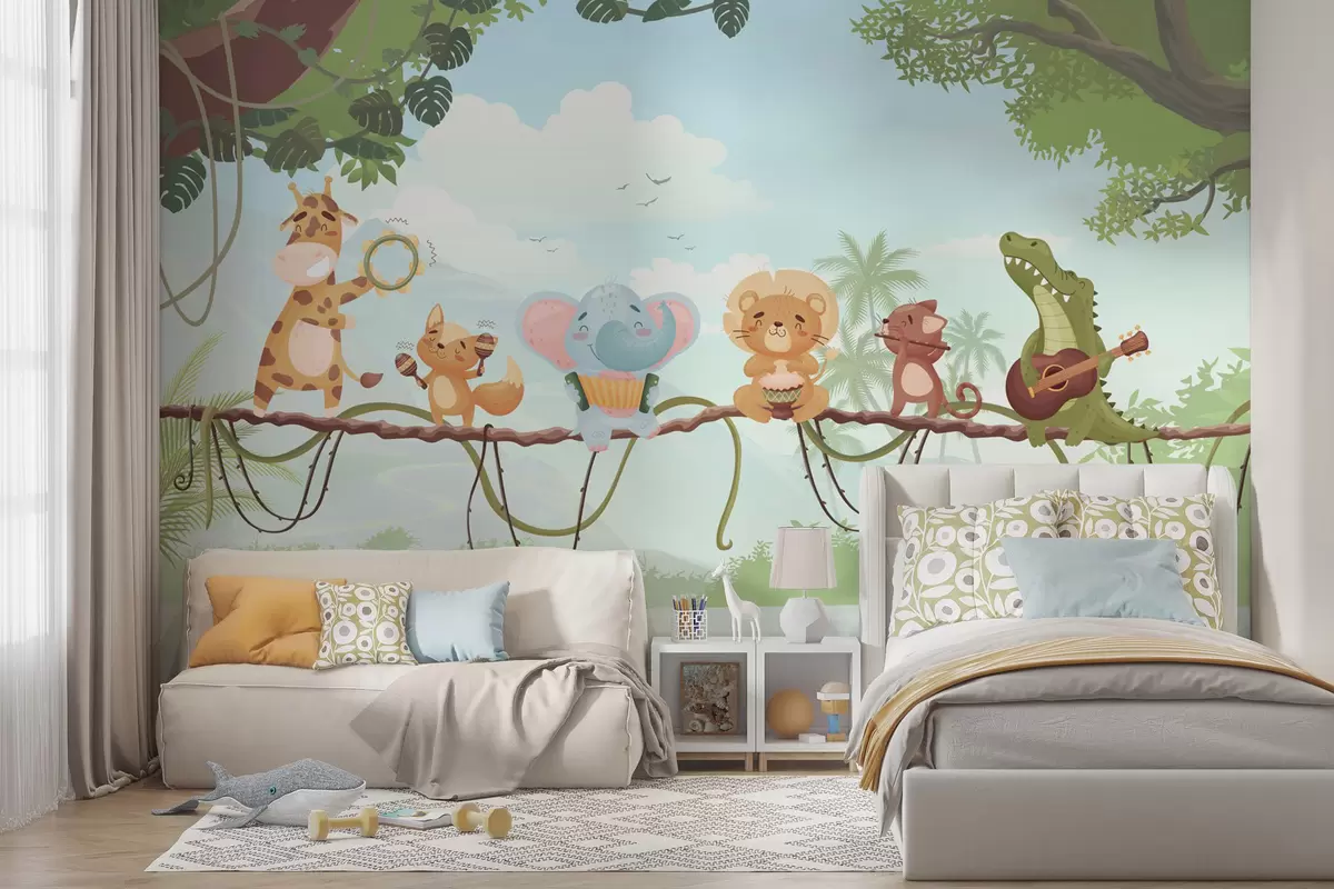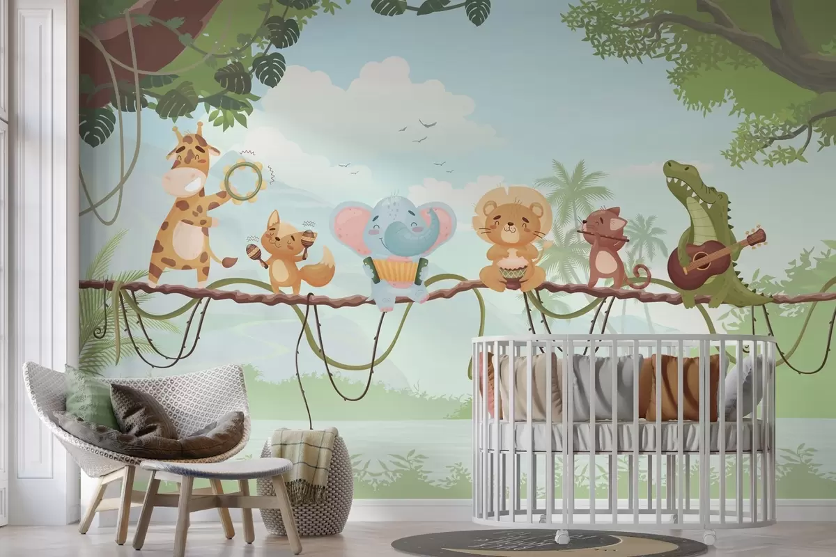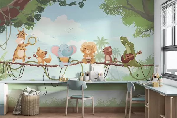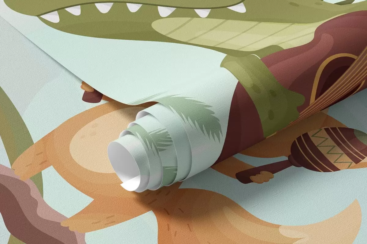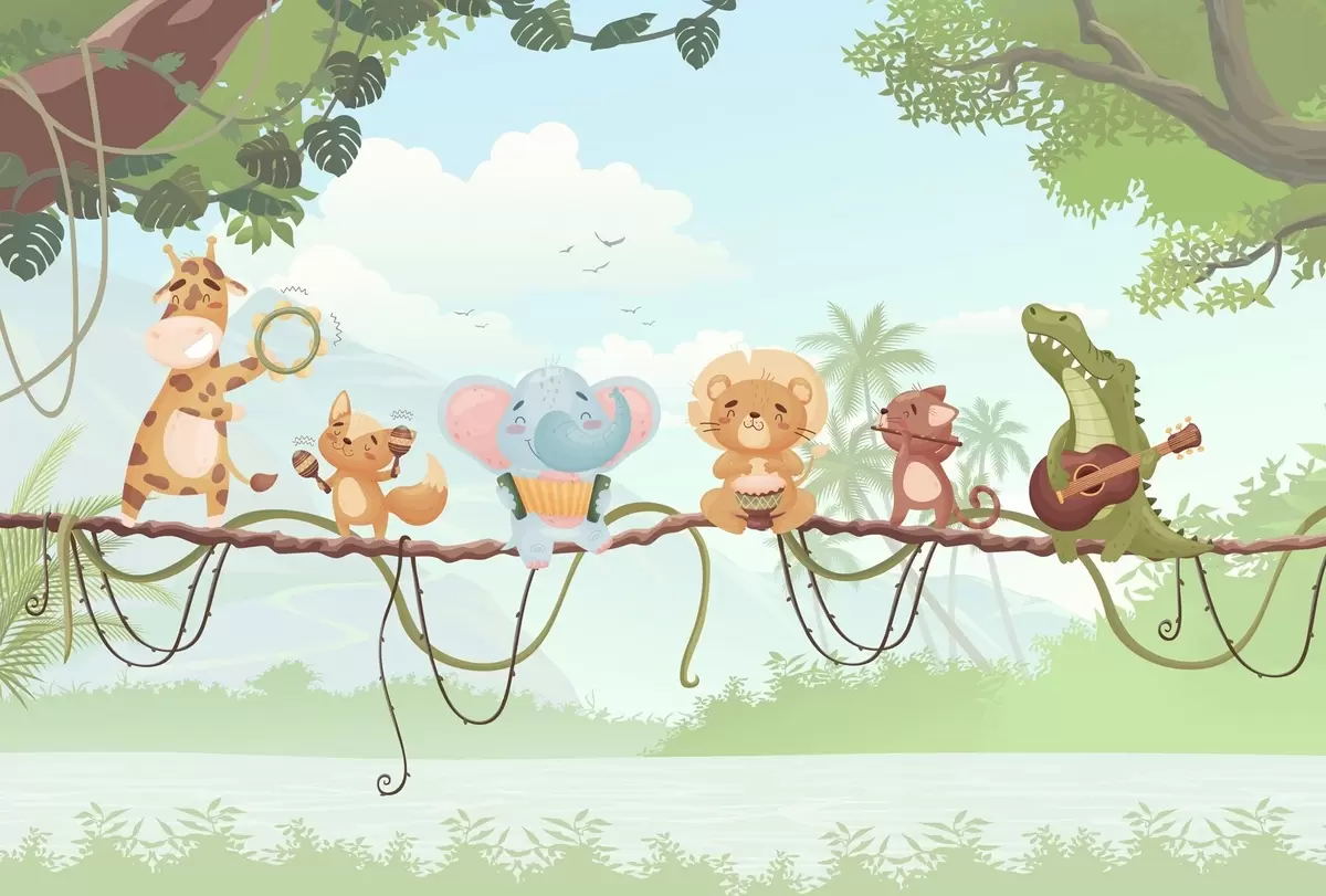 Papel tapiz Animales con instrumentos musicales frente a un paisaje tropical. Nr. w04505