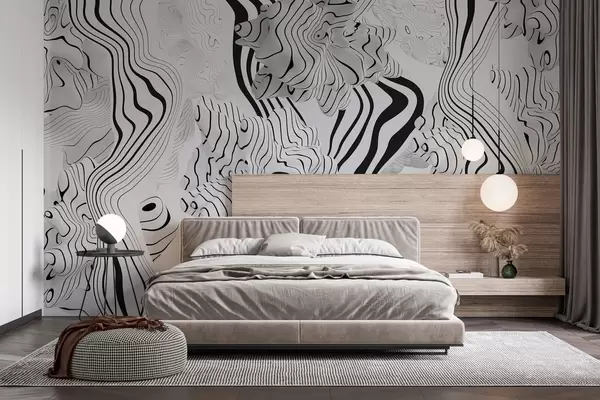 murales de pared formas orgánicas abstractas en estilo 3D en tonos blancos y grises con rayas negras w04627