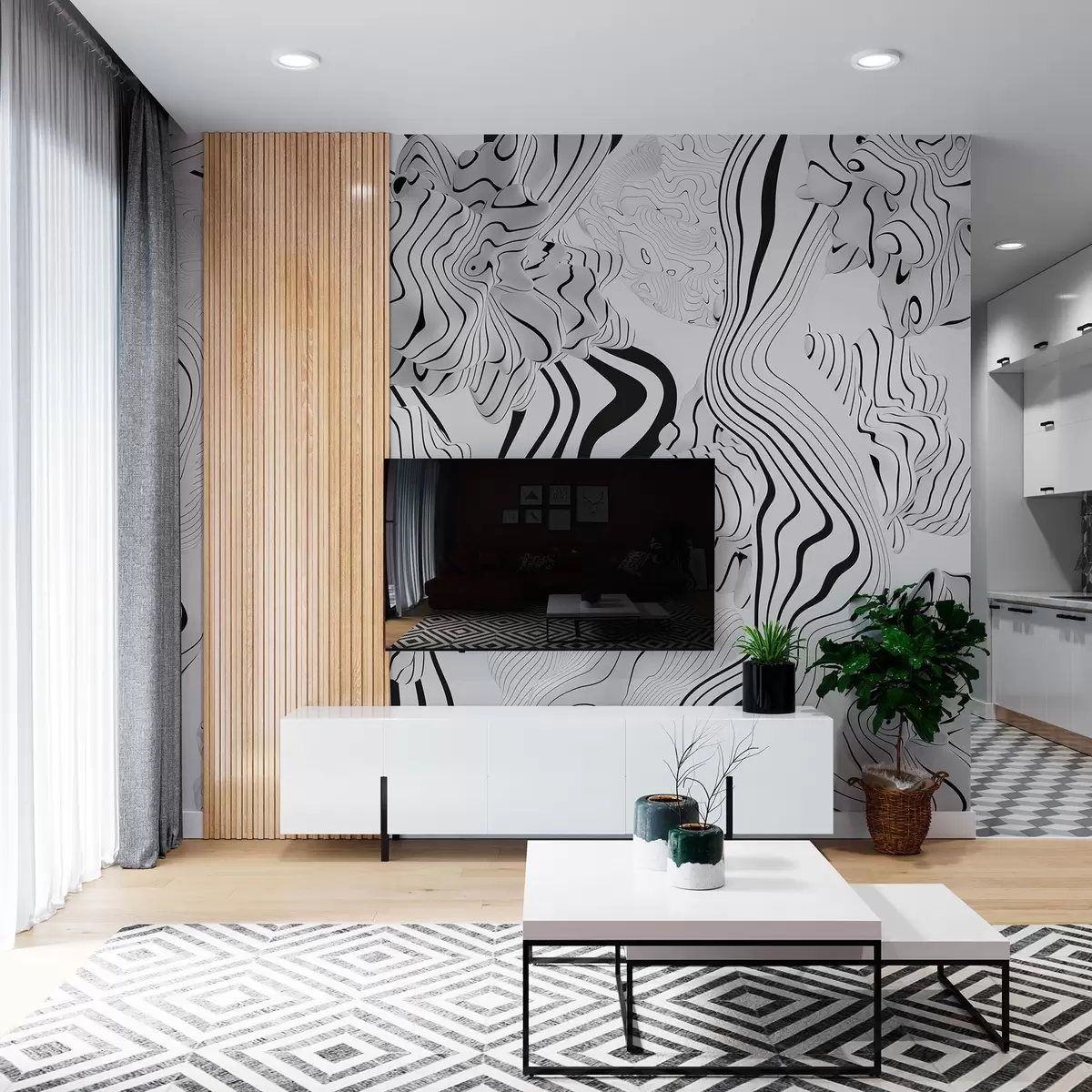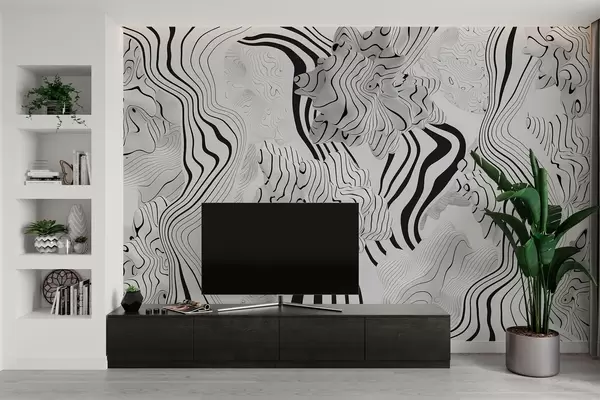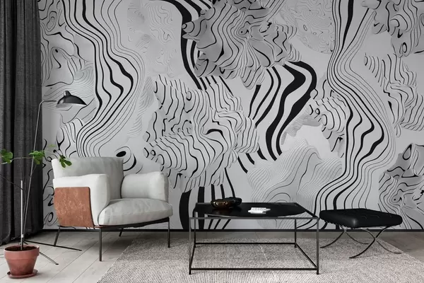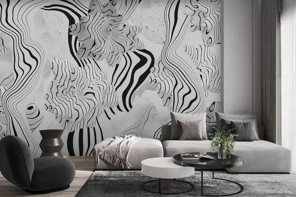 Papel tapiz formas orgánicas abstractas en estilo 3D en tonos blancos y grises con rayas negras Nr. w04627