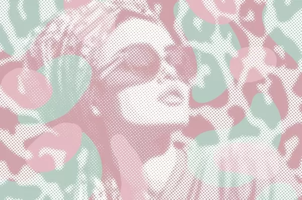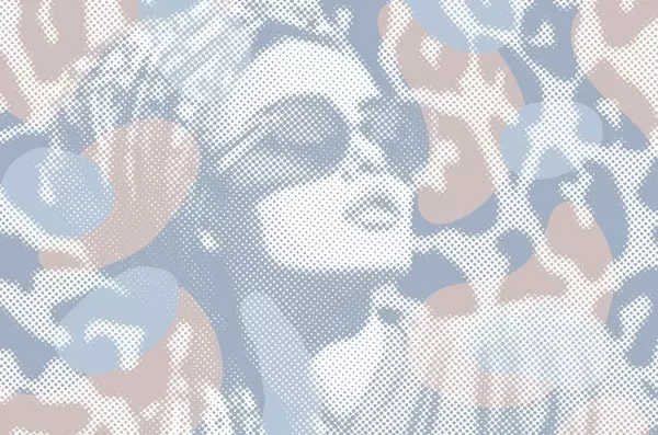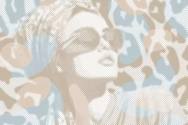 Papel tapiz retrato de una mujer sobre un fondo de leopardo en estilo punteado en tonos beige y azul Nr. w04630