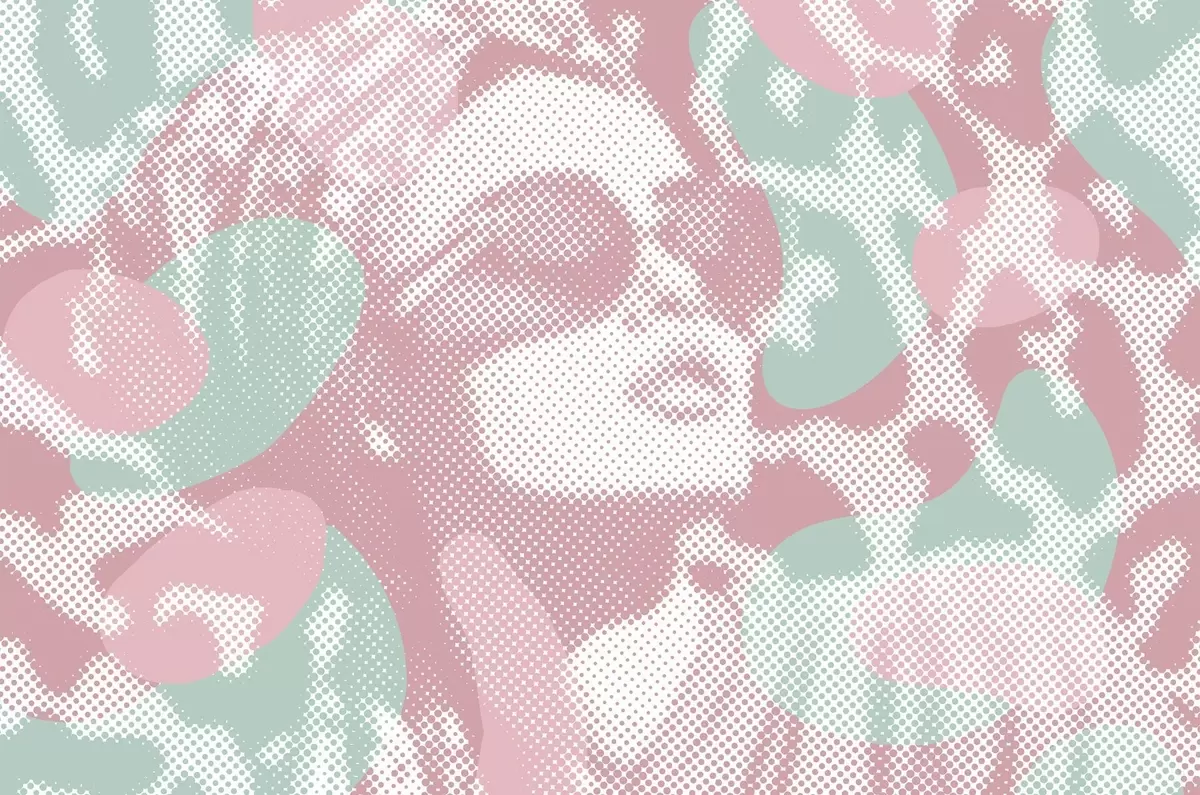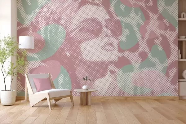 Papel tapiz retrato de una mujer sobre un fondo de leopardo en estilo punteado en tonos rosas y verdes Nr. w04630v2