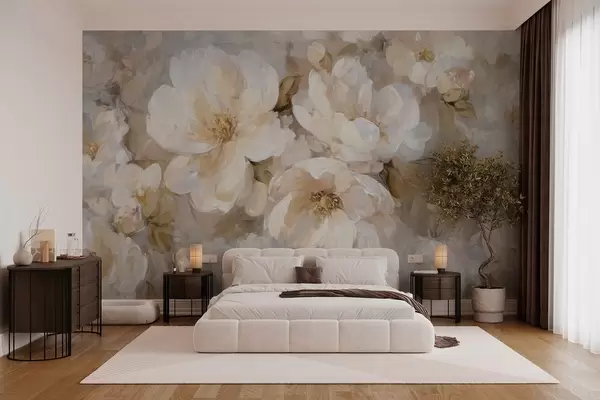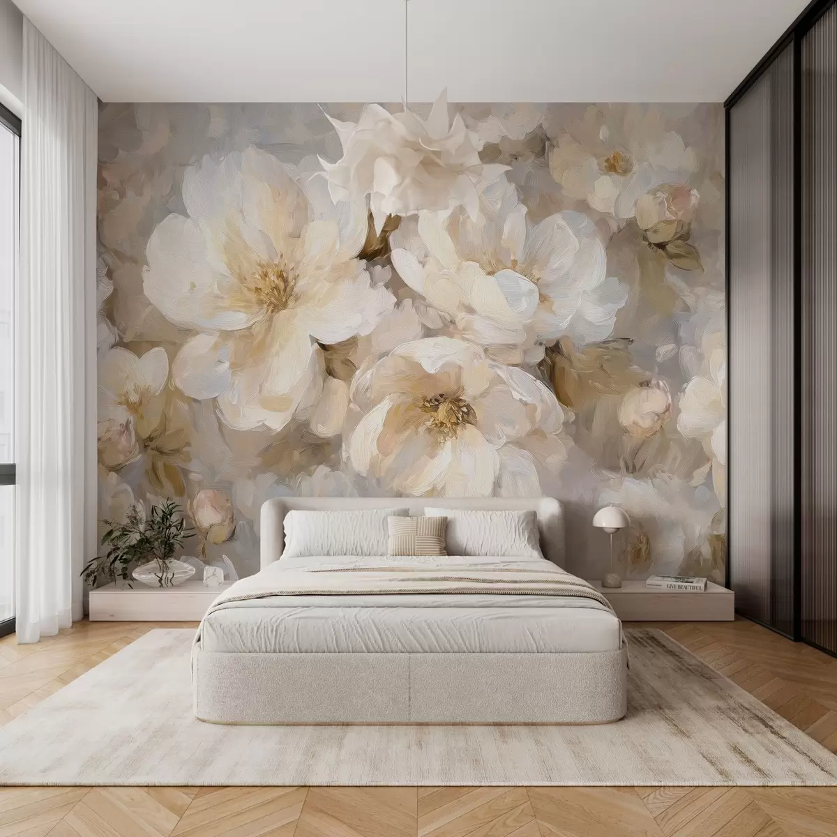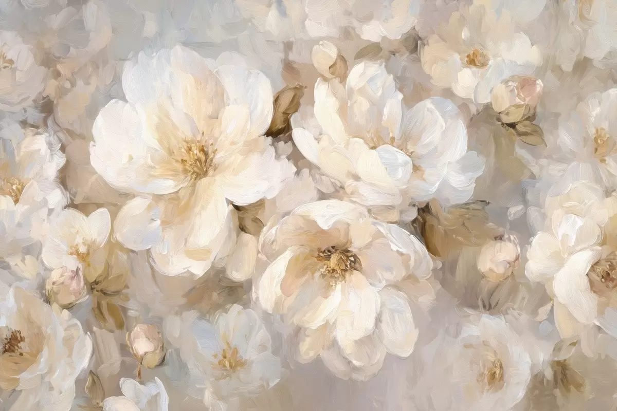 Papel tapiz flores grandes en tonos blancos y beige al estilo de la pintura al óleo Nr. w04633