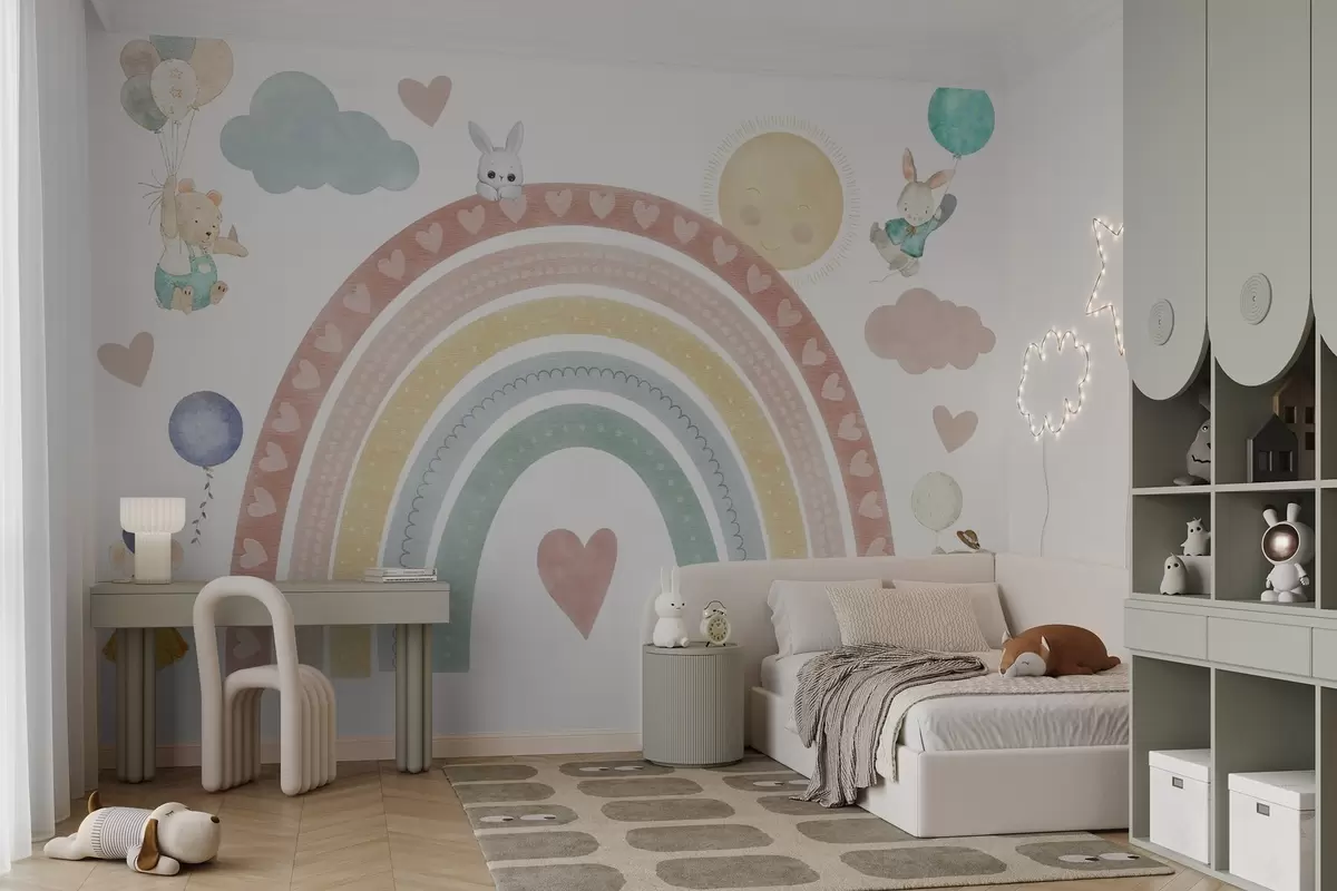 Papel tapiz Pastel arcoíris con corazones, animales y globos Nr. w04681