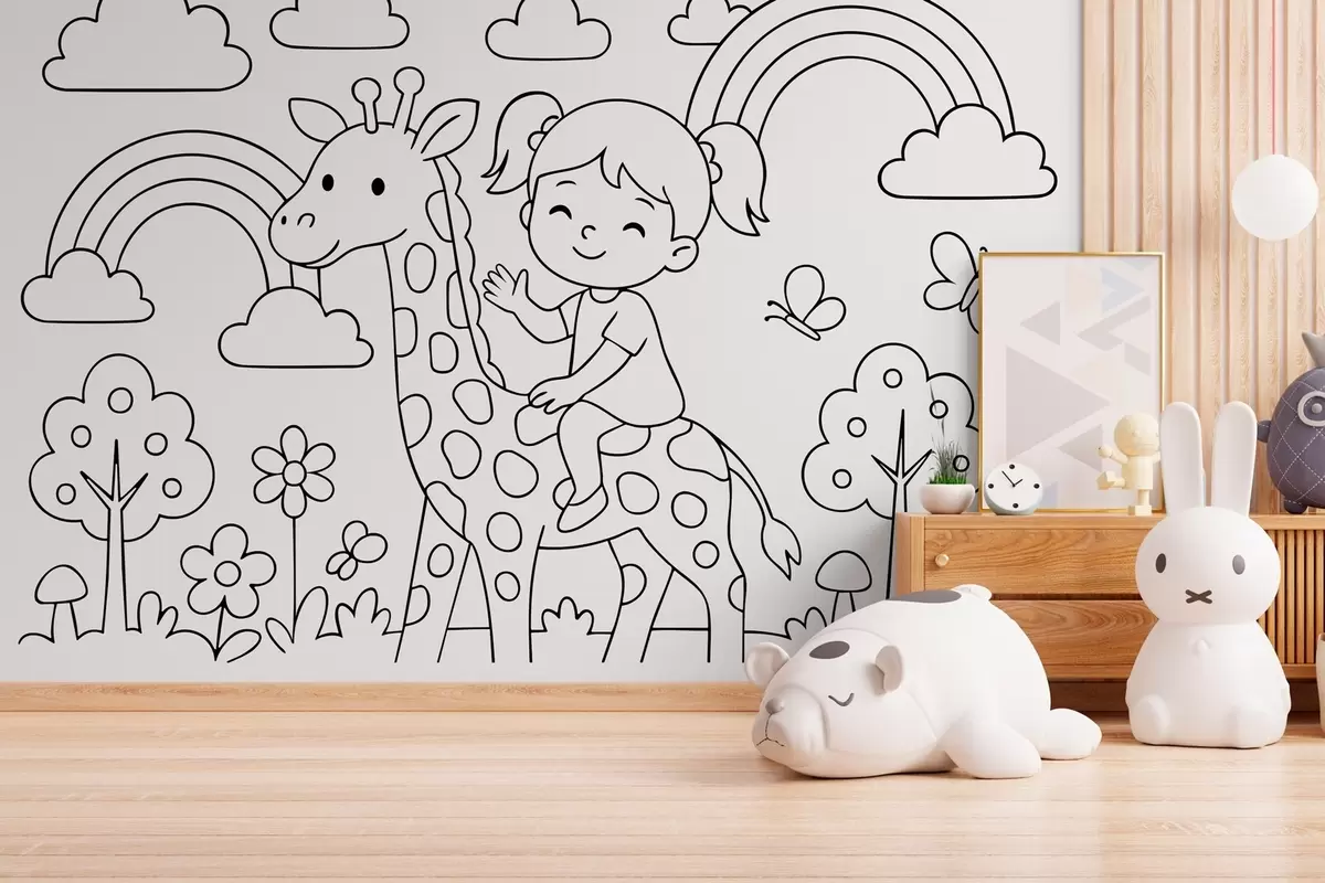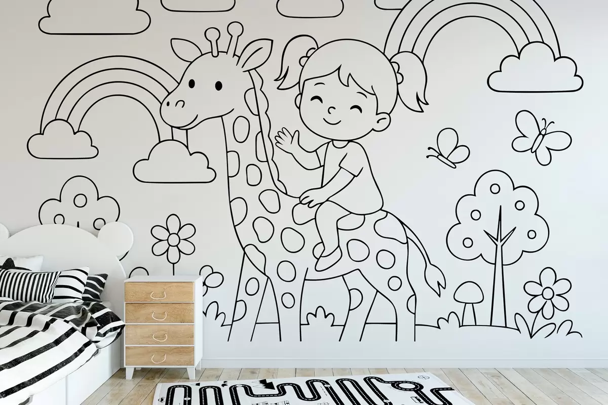 Papel tapiz dibujo en blanco y negro de una niña sobre una jirafa al estilo de un libro para colorear infantil Nr. w04753