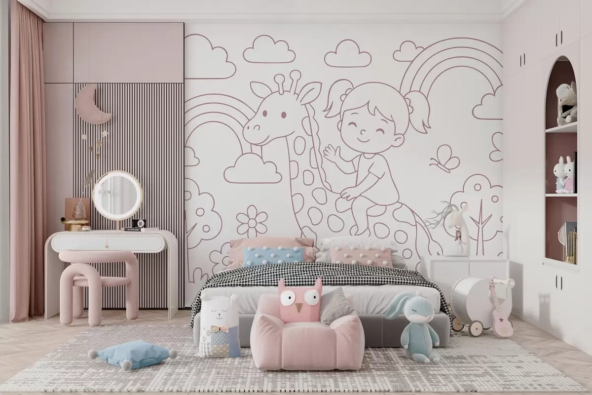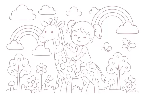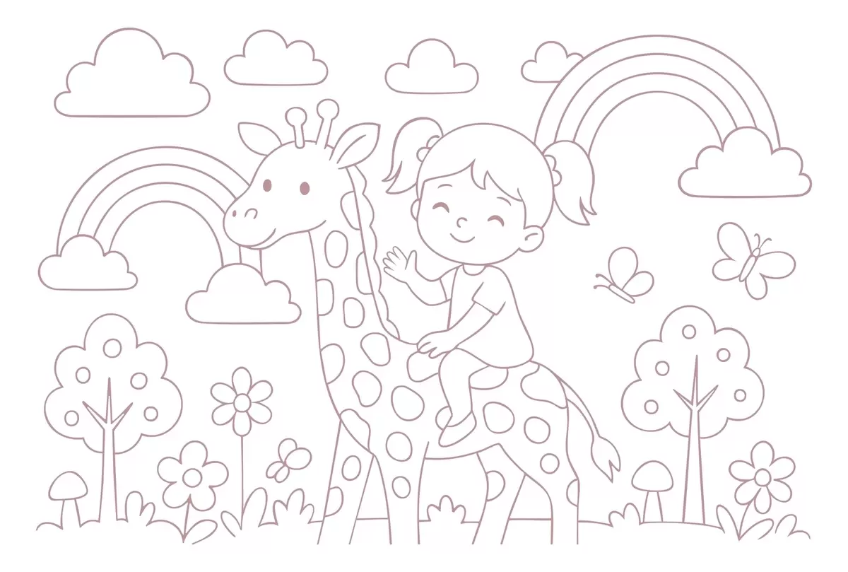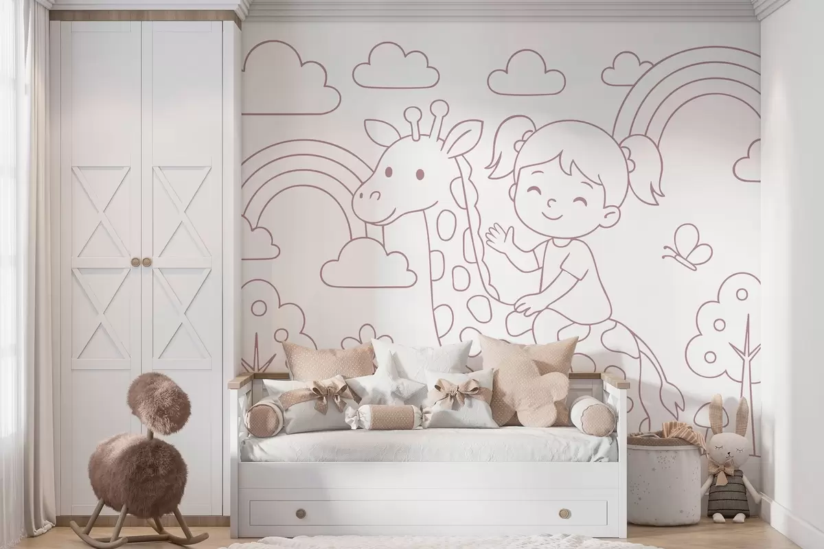 Papel tapiz pintura en polvo de una niña sobre una jirafa al estilo de un libro para colorear infantil Nr. w04753v1