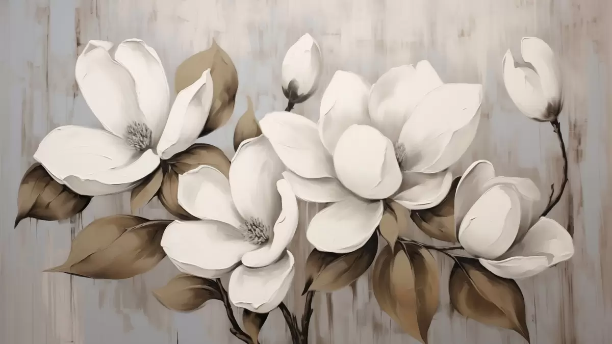 Papel tapiz Grandes flores de magnolia con hojas de color topo sobre fondo cepillado. Nr. w04785