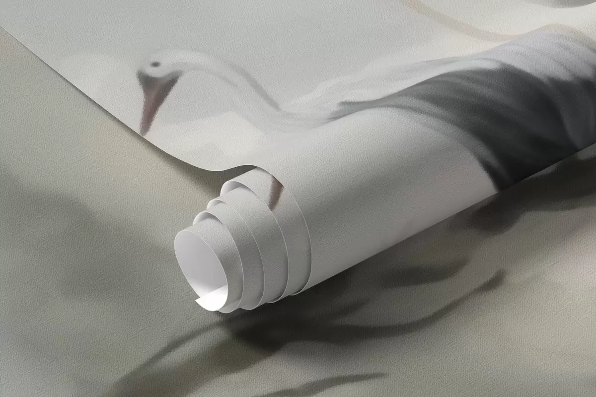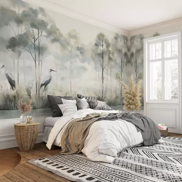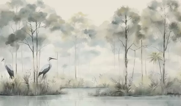 Papel tapiz Bosque brumoso junto al agua con garzas, paleta de colores suaves y fríos. Nr. w04788